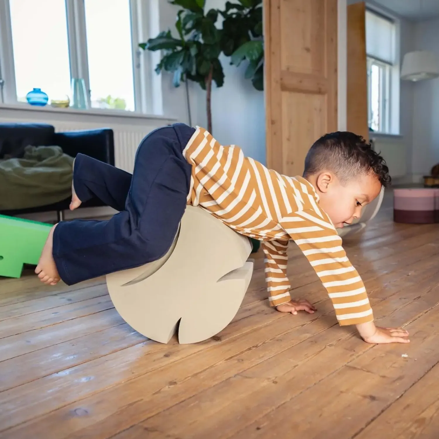Når barnet sidder overskrævs på Fiskens runding, trænes både balance og faldrefleks, og det bløde skridsikre EVA skum sikrer, at den står stabilt uden at ridse gulvet. Fiskens størrelse gør det let for barnet at bruge den som støtte, når der skal rejses op, og den kan vippe i alle retninger, hvilket styrker kropsbevidsthed og motorik.