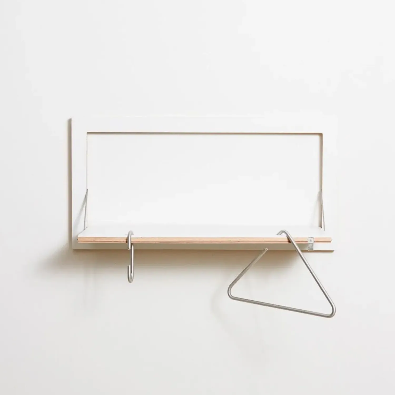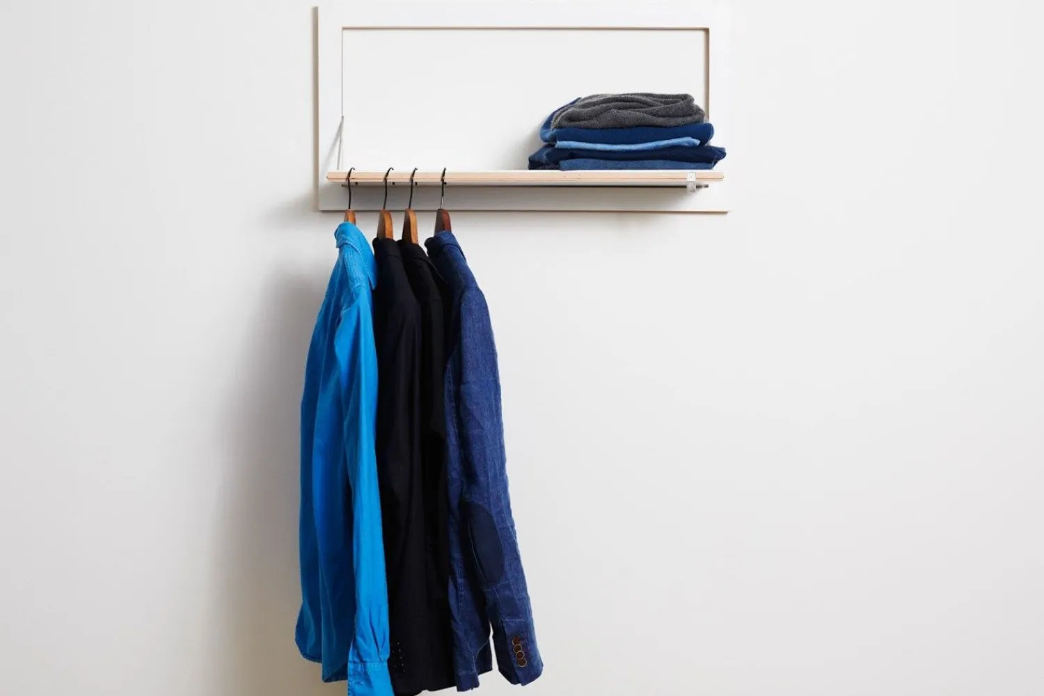 Selv om det ved første øjekast ser ud til at være en standard hylde, vil man ved nærmere inspektion opdage en smart tøjskinne. Når hylden er foldet sammen, trækker kun et tyndt spor opmærksomheden på den skjulte funktion.