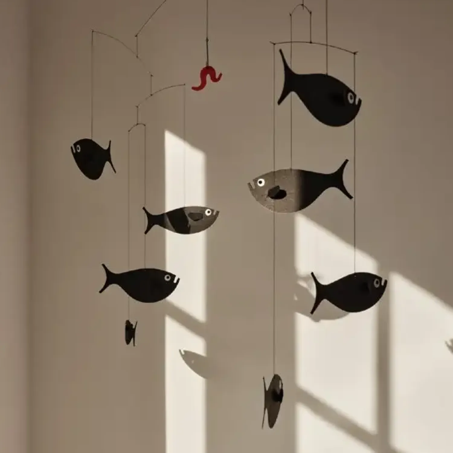 En sjov mobile fra Flensted hanging art, hvor fiskenes bevægelser får det til at se ud som de lokkes af den lille røde orm, der dingler på krogen. Perfekt til at hænge på børneværelset, i vinduet eller i et af hjørnerne i i dit hjem.