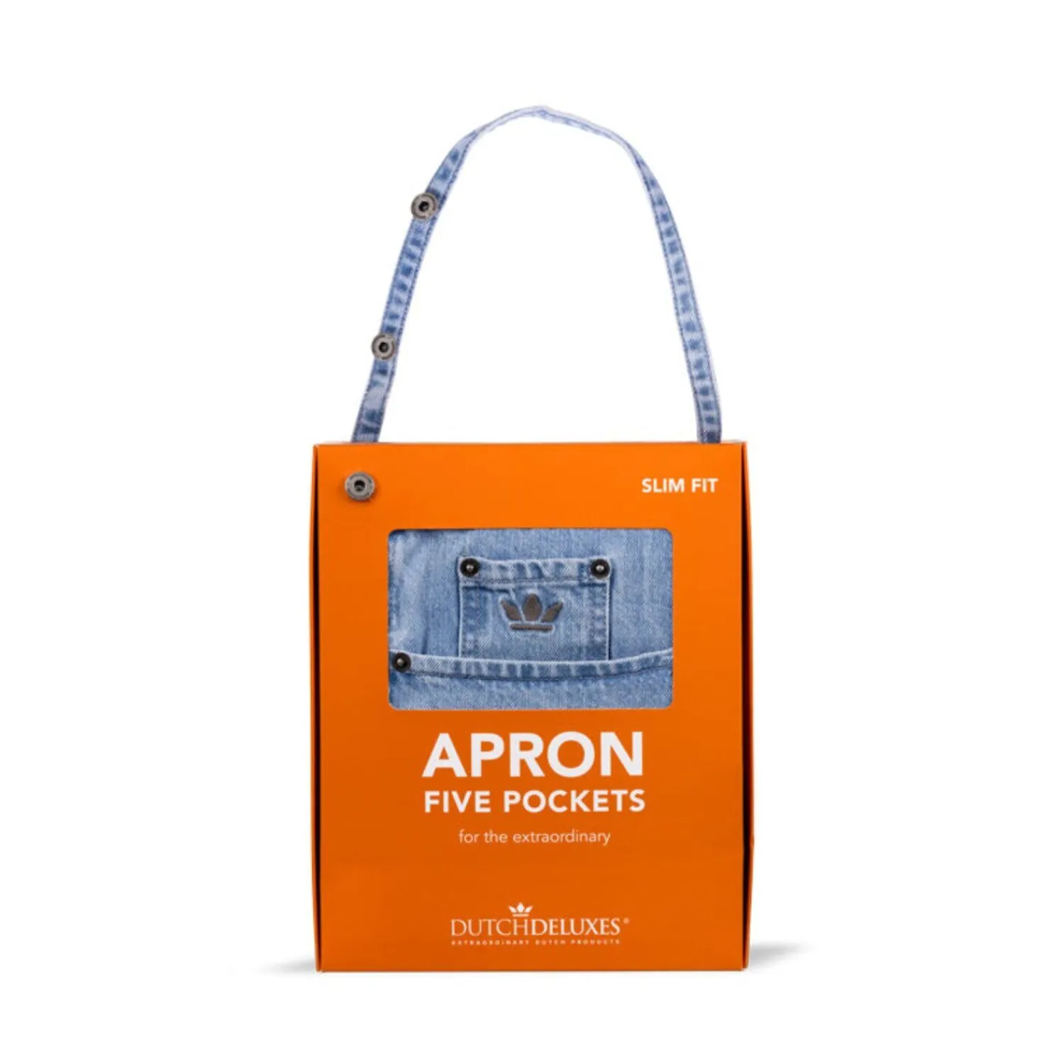 Baseret på pasformen på dine yndlingsjeans, er dette nye slim fit-forklæde med fem lommer et udtryk for det ultimative hollandske luksusdesign. Kombiner mode og mad som aldrig før! Denne slankere stil har et mere figursyet look, opnået med den rundede halsudskæring, slankere sidepaneler og en kortere længde. Snørerne kan bruges til at binde forklædet foran eller bagpå. Placeringen af de fem lommer refererer stærkt til jeansdesign: to mindre foran og to store, komfortable på siden med den berømte lille urlomme på den ene side. Alt forstærket af mærkevarenitter. Slim fit: Denne slankere model har et mere figursyet look, opnået med den rundede halsudskæring, slankere sidepaneler og en kortere længde. Snørerne kan bruges til at binde forklædet foran eller bagpå. Meget behagelig at have på. Knapper med logo til at justere remmen for perfekt pasform.