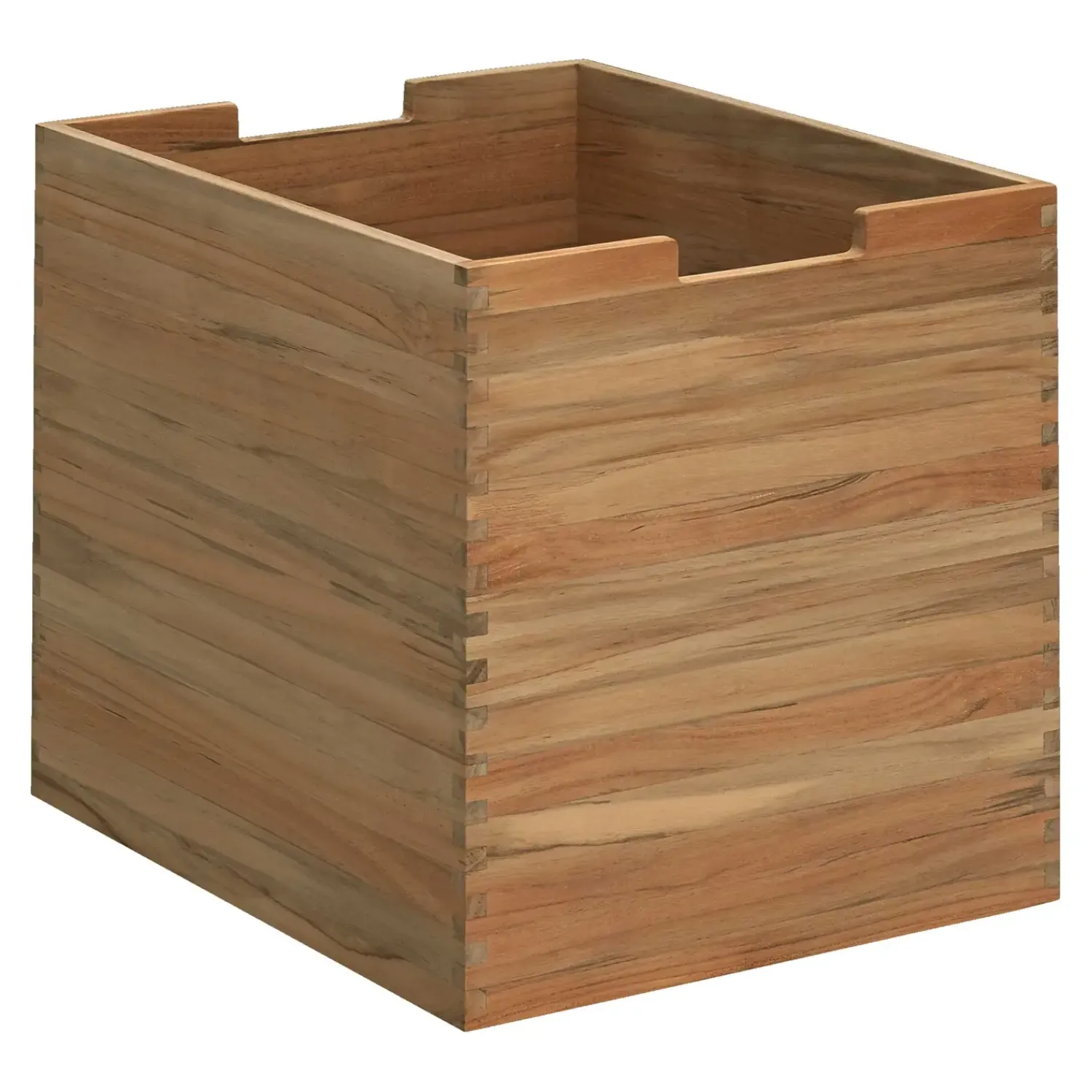 Denne opbevaringsboks er designet som et praktisk tilbehør til Cutter-bænken. Boksen er fremstillet i teak af Skagerak/Trip Trap og måler 30 x 36 x 34 cm. De synlige samlinger i hjørnerne viser håndværket bag produktet.
