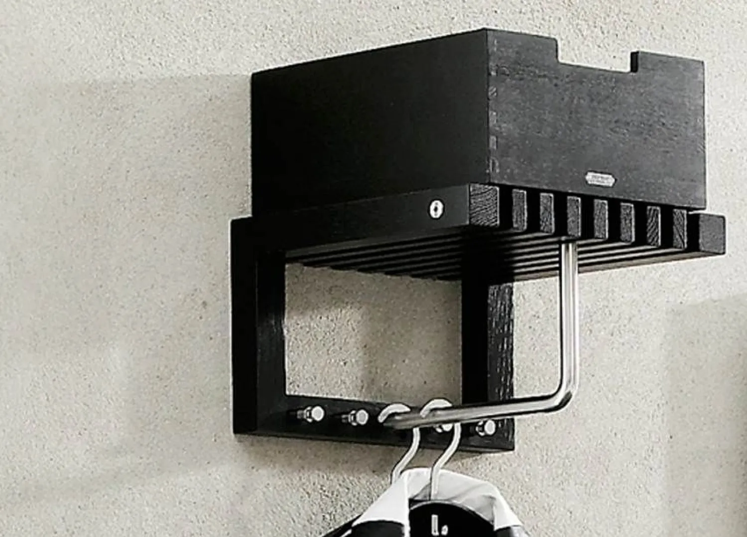 Kassen er udviklet som tilbehør til Cutter Garderobe, hvor rillerne under sikrer, at den står stabilt. Det sortbejdsede egetræ matcher garderobens udtryk, så du får en sammenhængende løsning. Du kan bruge den alene eller sammen med garderoben, alt efter hvad der passer bedst til dit rum.