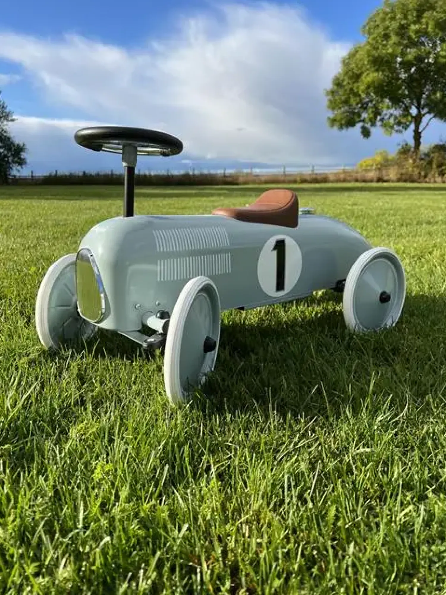 Magni – Gåbil Classic Racer i metal, oliven grøn er designet med fokus på sikkerhed og komfort for de små. Den lave siddehøjde og frontstyringen giver barnet en stabil køretur. Gummihjulene muliggør stille og behagelig kørsel på forskellige underlag, både inde og ude, hvilket gør den velegnet til mange forskellige legesituationer.