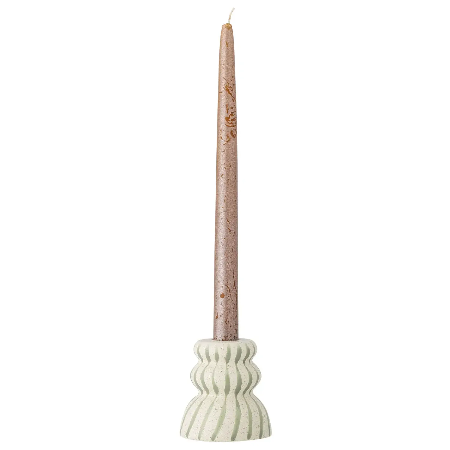 Denne hånddekorerede lysestage fra Bloomingville kombinerer traditionelt håndværk med holdbart stentøj. De bølgede mønstre og skiftende nuancer mellem lys- og mørkegrøn gør hver lysestage særpræget, mens den robuste konstruktion sikrer lang holdbarhed.