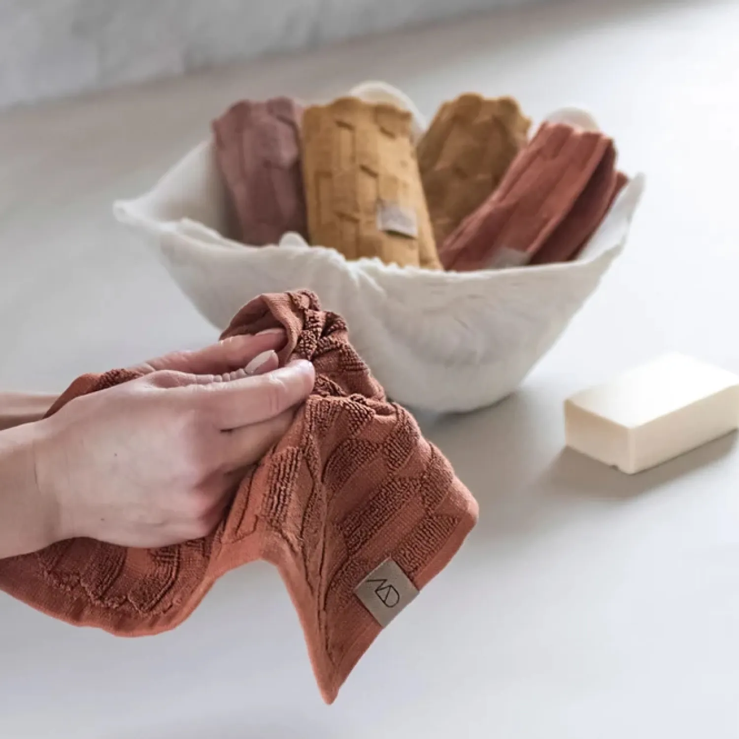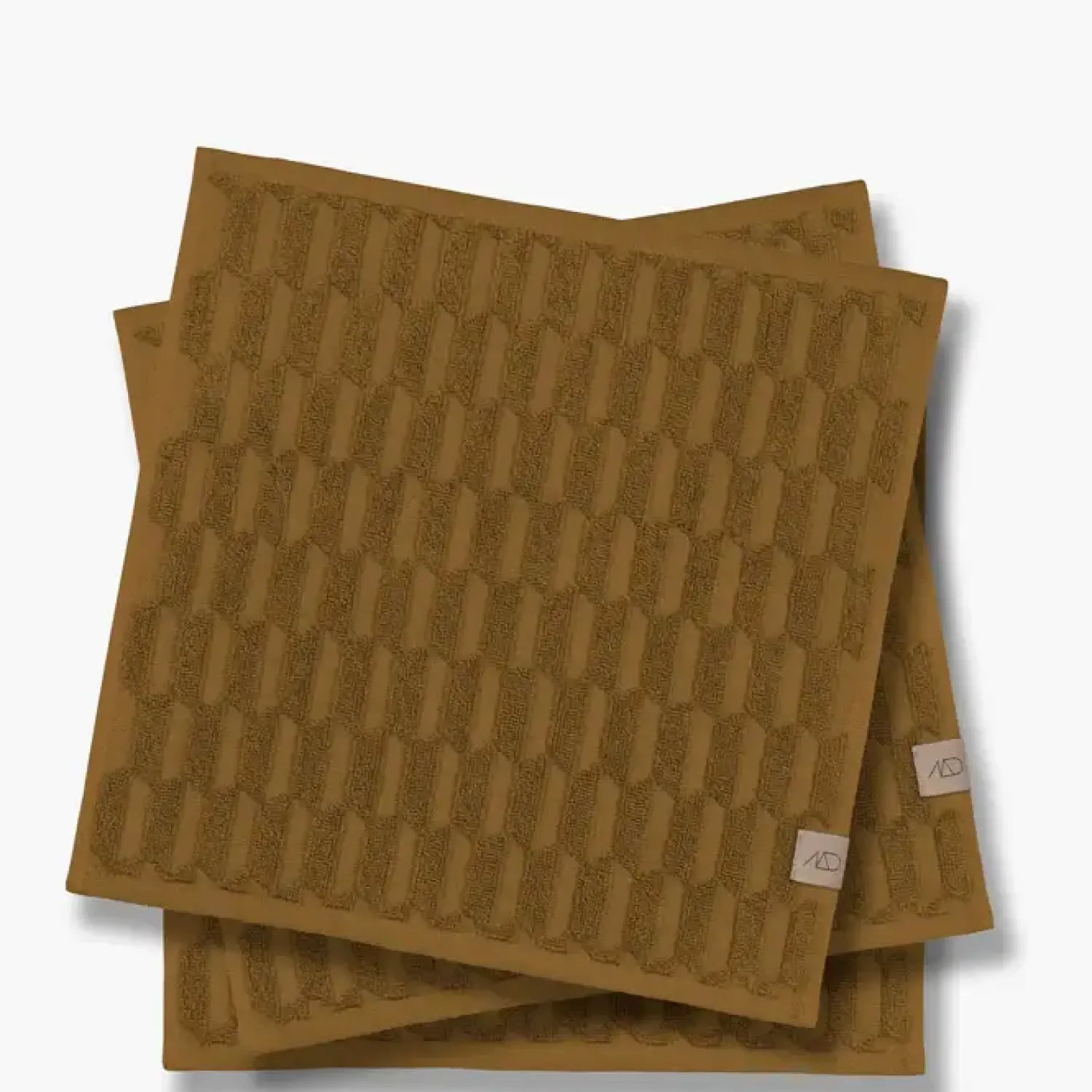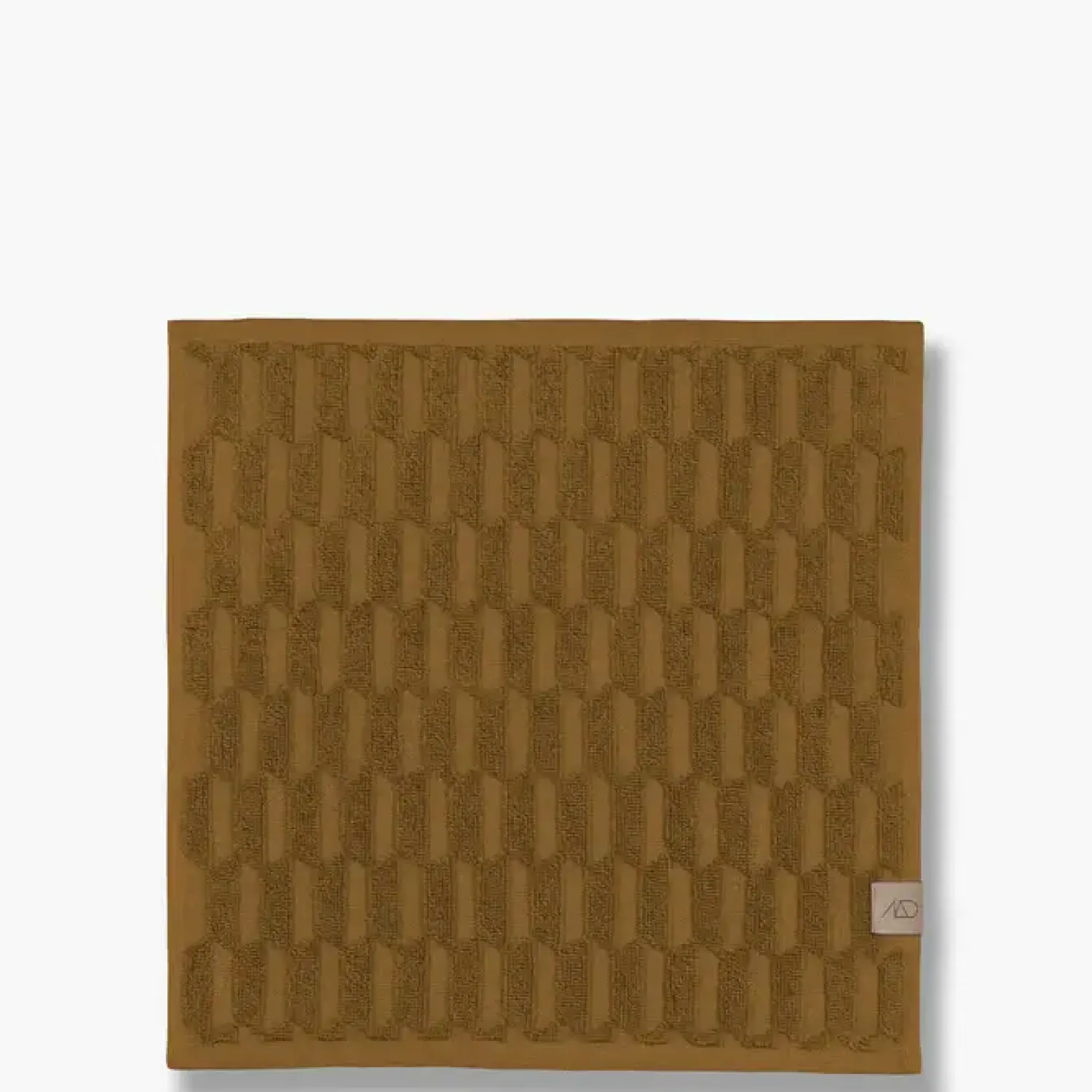 GEO er fremstillet med en ”høj-lav” væveteknik, hvor designets sekskantede form deles i to halvdele. Det giver et næsten tredimensionelt, grafisk mønster med en lys og en mørk halvdel. Til serien fås også matchende håndklæder i tre størrelser samt bademåtten. GEO er fremstillet i OEKO-TEX® 100-certificeret bomuld, med en lav tæt luv, som gør minihåndklædet både meget absorberende og yderst slidstærkt. Sælges i pakker á 3. stk.