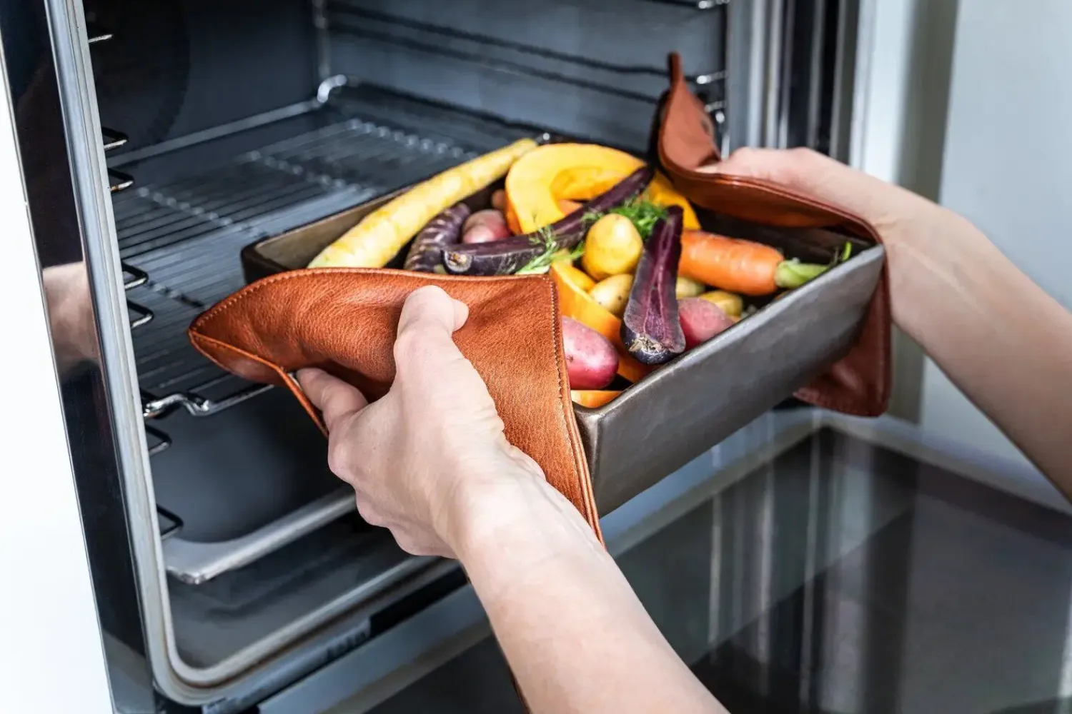 Smart grydelapp i fuldnarvet læder i gaveæske. Med sin integrerede indsats og varmebestandige foring vil denne grydelapp modstå varmen og give dig et bedre greb om tingene! Dine hænder er fuldt beskyttet af den varmebestandige foring, og for at få et bedre greb kan du stikke hånden i indsatsen, så det er nemmere at gribe fat i varme tallerkener og ovnfaste fade. De er lavet af det mest smidige fuldnarvede og REACH-certificeret læder og fås i alle farver, der matcher vores læderforklæder. De vil blive endnu smukkere med tiden: jo mere du bruger dem, jo pænere vil de se ud, da tiden vil skabe en patina, en blød glans, der udvikler sig på læderets overflade, da det er et naturprodukt, der ældes. En perfekt kombination med vores læderforklæder i alle farver og nemme at rengøre. Varmebestandig foring til normal brug op til 240 °C [460 °F].