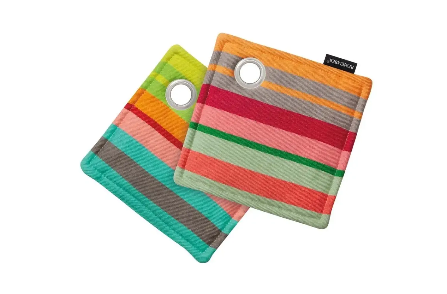 Disse grydelapper er designet til at være både funktionelle og dekorative. De livlige farver og striber passer perfekt ind i et moderne køkken, men kan også tilføje et farverigt touch til mere traditionelle indretninger. Med en effektiv beskyttelse mod varme er de ideelle til håndtering af varme gryder, pander eller fade fra ovnen. Den kompakte størrelse på 18,5 x 18,5 cm gør dem nemme at manøvrere med, selv i trange køkkener, mens højden på 2 cm sikrer god isolering.