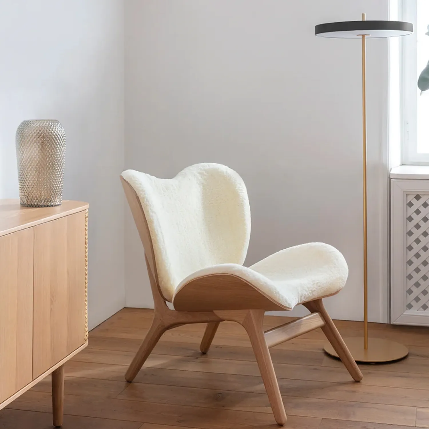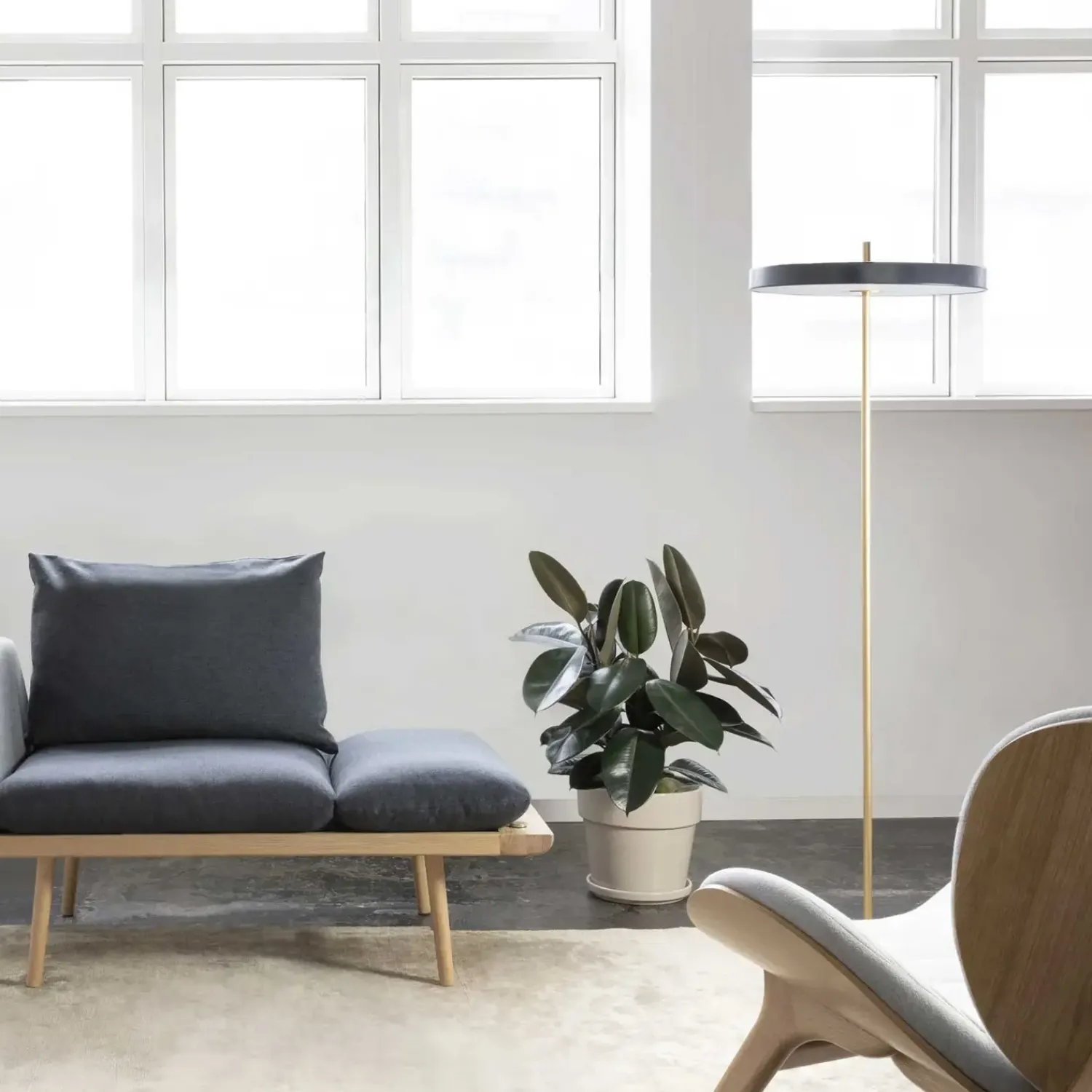 Med sit minimalistiske udtryk går den flotte Asteria Floor gulvlampe fra Umage aldrig af mode. Den gennemgående messingbase er med til at forstærke det enkle og elegante udtryk.