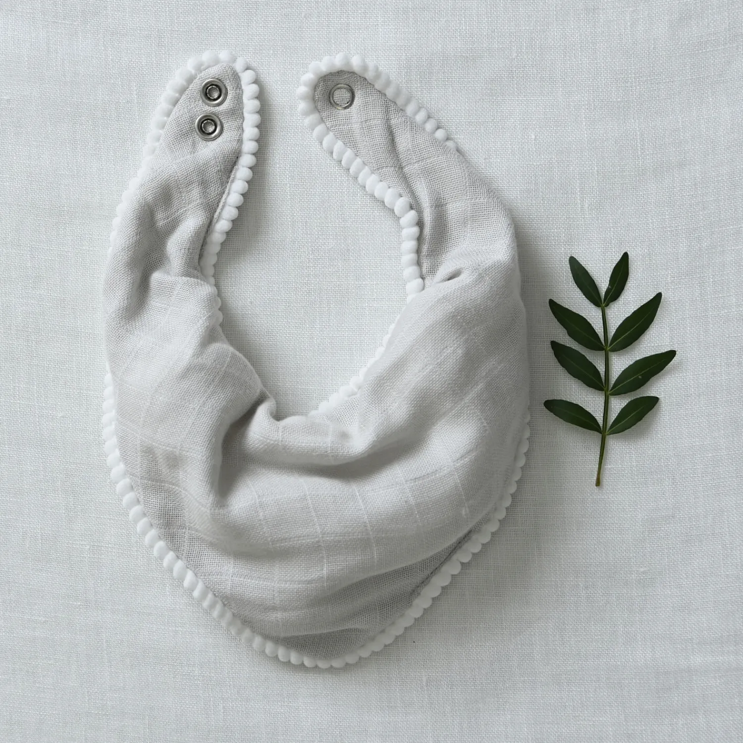 Denne hagesmæk fra Jack o Juno er et funktionelt tilbehør. De bløde pom-pom-kanter giver et særligt præg, mens de praktiske trykknapper i nakken sikrer, at hagesmækken kan tilpasses i to størrelser. Den lyse grå farve er neutral og gør den velegnet til både drenge og piger.