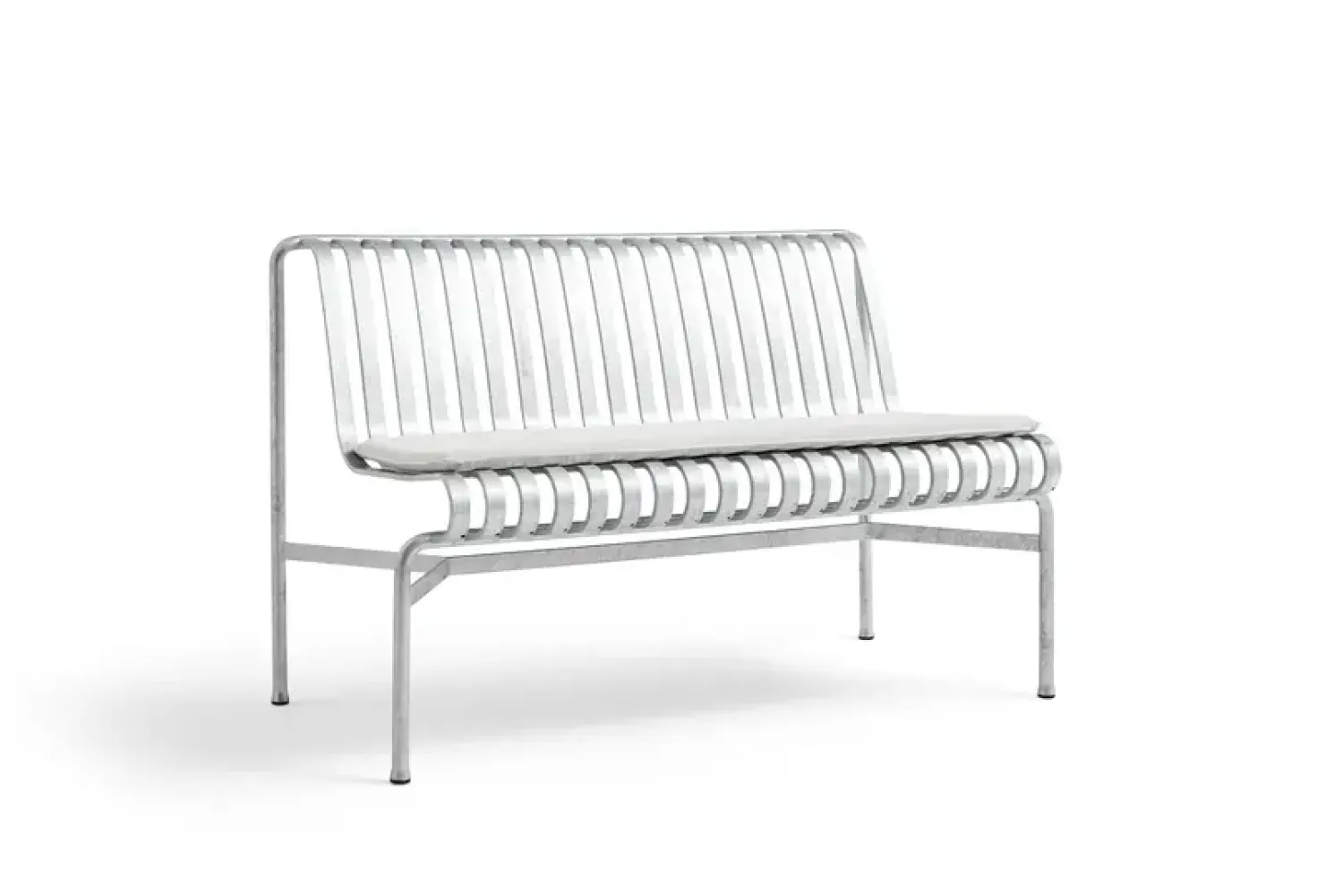 Med dimensioner på 120 cm i bredden, 70 cm i dybden og 80 cm i højden er denne bænk designet til at passe ind i forskellige udendørs miljøer. Den armløse udformning er en praktisk funktion, der gør det muligt at placere bænken tæt ved et bord eller som en selvstændig siddeplads i haven. Hay Palissade Dining Bænk er egnet til dem, der søger en kombination af funktionalitet og æstetik i deres udendørs møbler. Den tilbyder siddeplads til flere personer og fungerer samtidig som et designelement i havens eller terrassens indretning. Bænken kan kombineres med andre møbler fra Hays Palissade-serie for at skabe et sammenhængende udendørs rum. Den kan anvendes til daglige måltider, som del af en større havemøbelgruppe eller som et enkeltstående element på en moderne tagterrasse. Bænkens galvaniserede finish giver den en industriel æstetik, der kan tilføre et moderne præg til ethvert udendørs område. Det armløse design gør det nemt for brugerne at sætte sig og rejse sig, hvilket kan være praktisk ved udendørs sammenkomster. Materialevalget og konstruktionen er optimeret til at håndtere skiftende vejrforhold, hvilket gør bænken til en holdbar løsning for udendørs siddepladser året rundt.