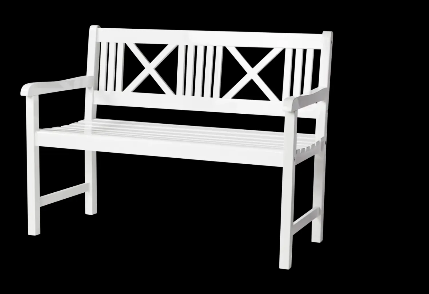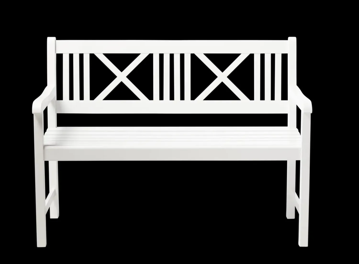 Bænken er konstrueret af mahogni, hvilket bidrager til dens robusthed. Den hvide PU-glansmaling giver bænken et distinkt udseende og gør den vandtæt, hvilket øger dens modstandsdygtighed over for vejr og vind. Rygstøtten med X-formede designelementer og armlæn er inkluderet for at tilbyde støtte til brugerne.