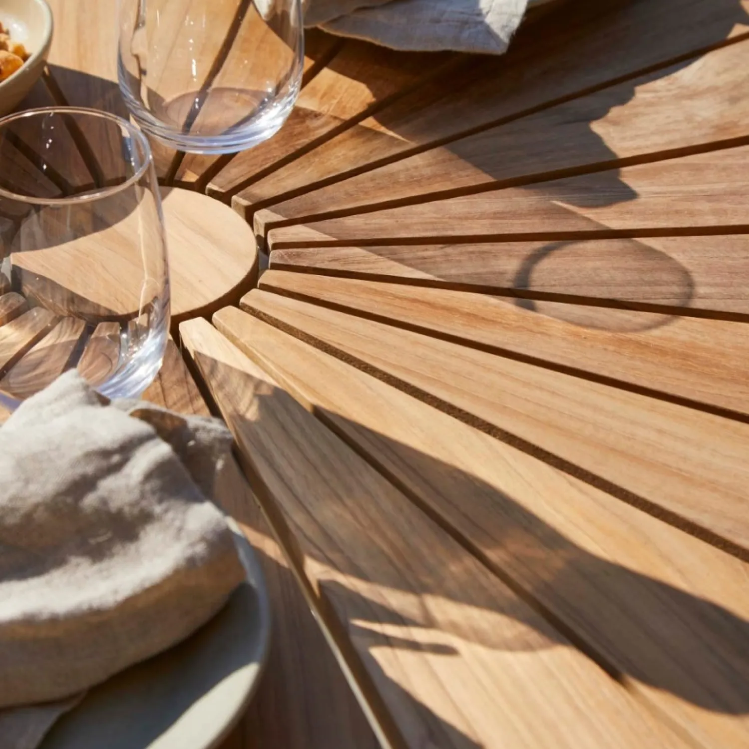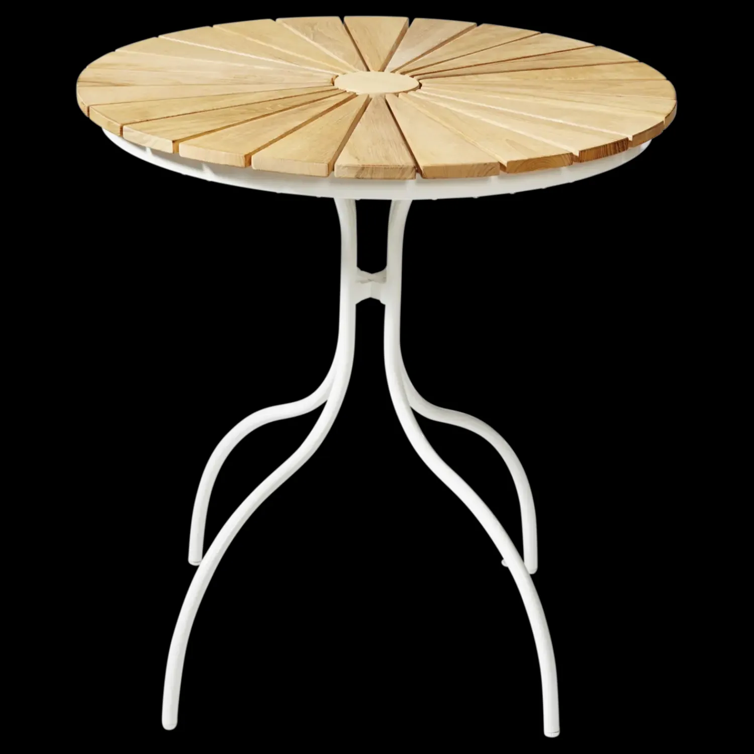 Cafébordet kombinerer teaktræets naturlige udseende med aluminiums egenskaber. Den runde bordplade med teaklameller giver en karakteristisk overflade, mens de hvide pulverlakerede aluminiumsben er valgt for deres egenskaber, som ofte forbindes med stabilitet og modstandsdygtighed over for vejrpåvirkninger. Denne kombination af materialer skaber et bord, der er designet til udendørs brug.