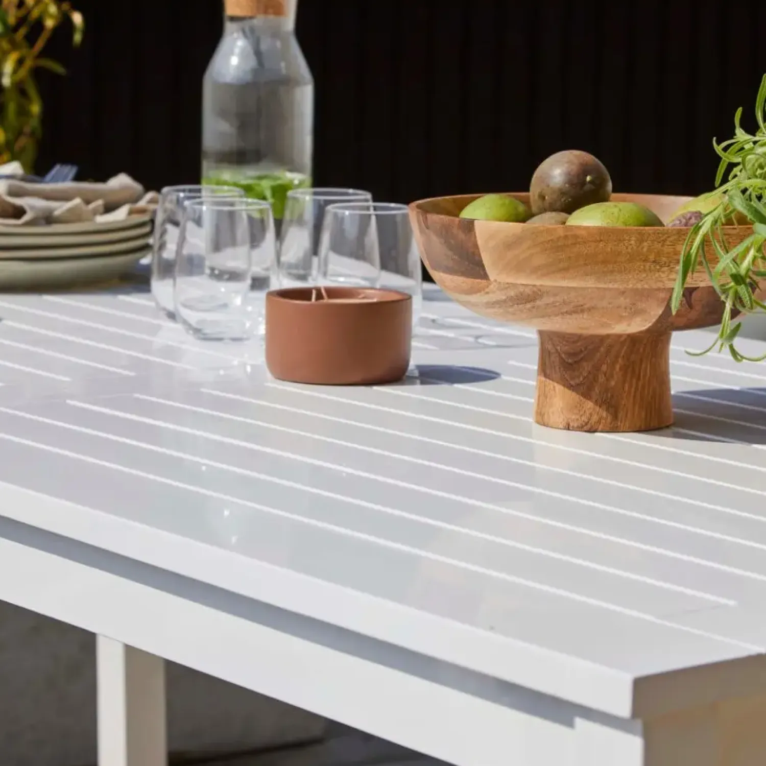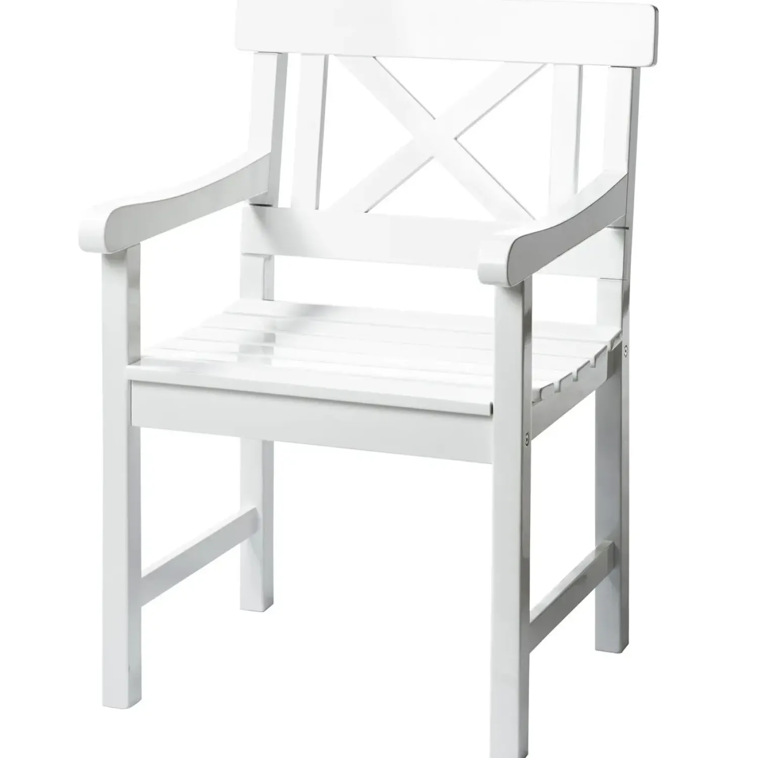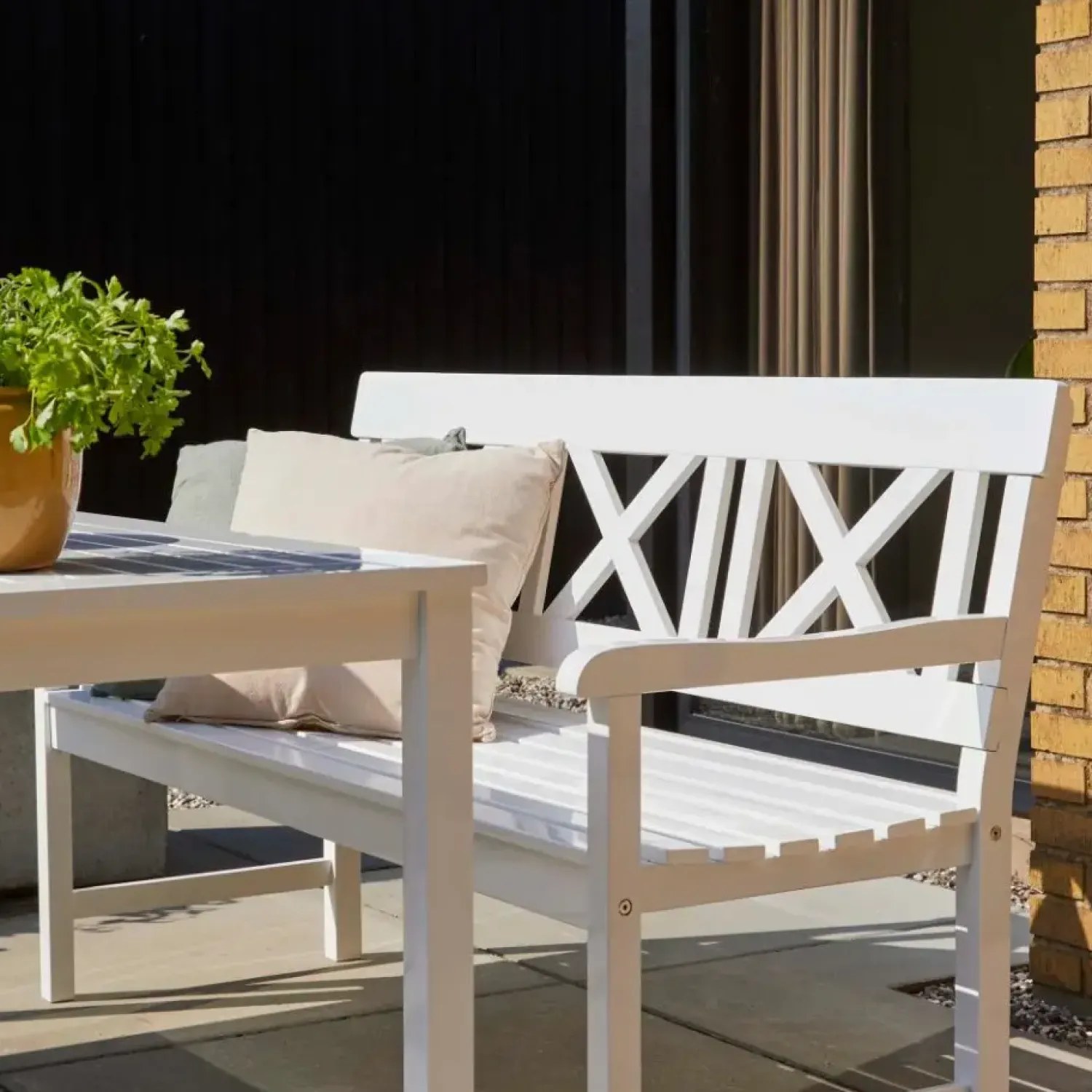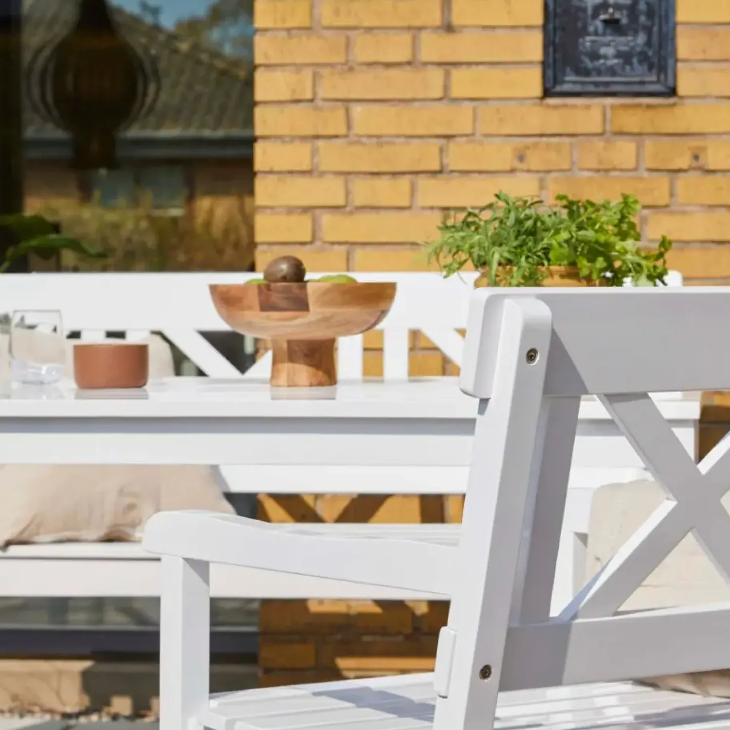 Sofiero-sættet udmærker sig ved sin robuste konstruktion af mahogni-træ. Den hvide PU-glansmaling gør møblerne vandtætte og modstandsdygtige over for vejr og slitage, hvilket sikrer lang levetid og nem vedligeholdelse.