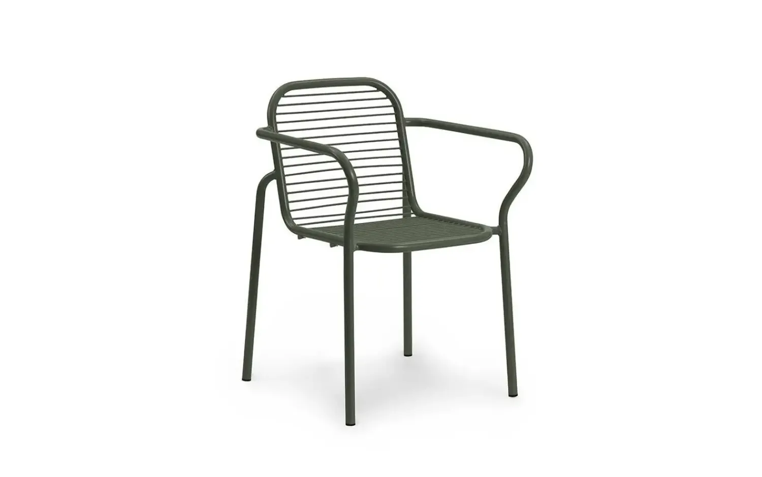 Vig havestolen kombinerer dobbelt pulverlakeret stål og olieret Robinia-træ i et holdbart design. Den mørkegrønne farve giver stolen et roligt udtryk, mens de buede armlæn sikrer en behagelig siddekomfort i haven.