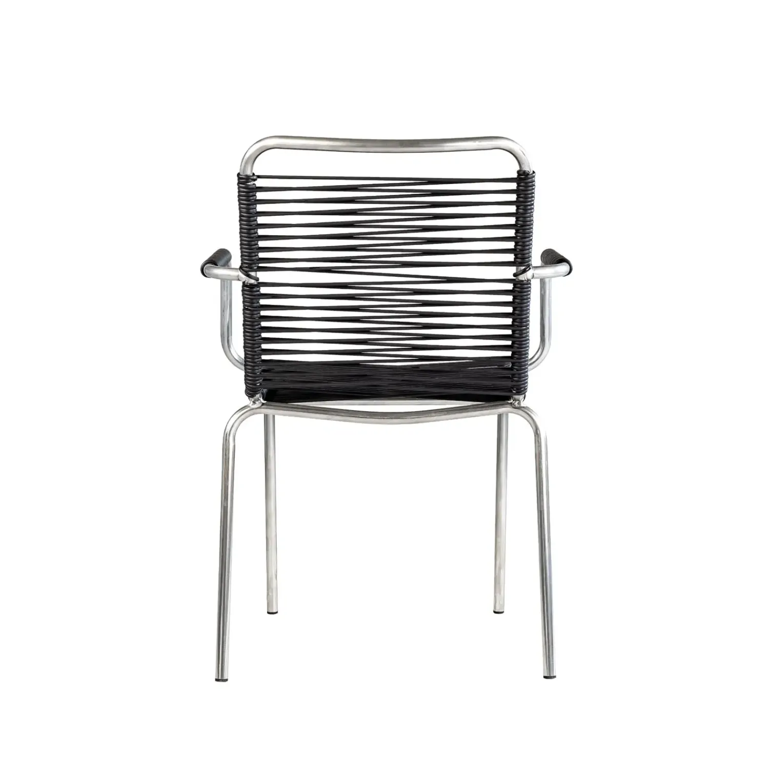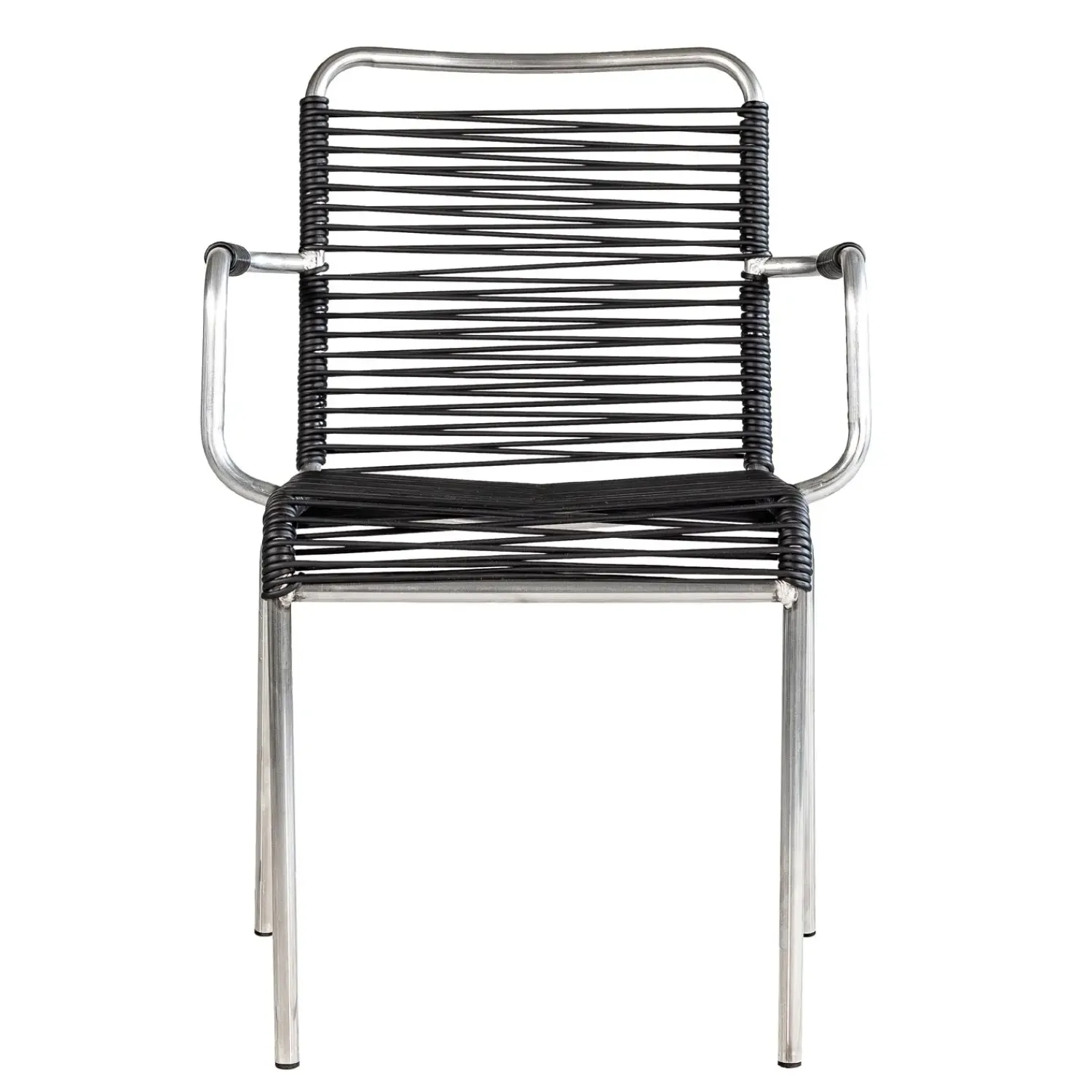 Stolen udmærker sig ved sin særlige konstruktion. Sæde, ryg og armlæn er omhyggeligt håndvævet i sort PVC spaghetti, hvilket giver et sofistikeret udseende og en behagelig siddekomfort. Den lette aluminiumsramme sikrer holdbarhed uden at gå på kompromis med mobiliteten. Denne kombination af materialer gør stolen velegnet til udendørs brug og nem at vedligeholde – ideel til forskellige udendørsmiljøer. Småridser i aluminiumet bliver mindre synlige over tid, hvilket giver stolen en charmerende patina.