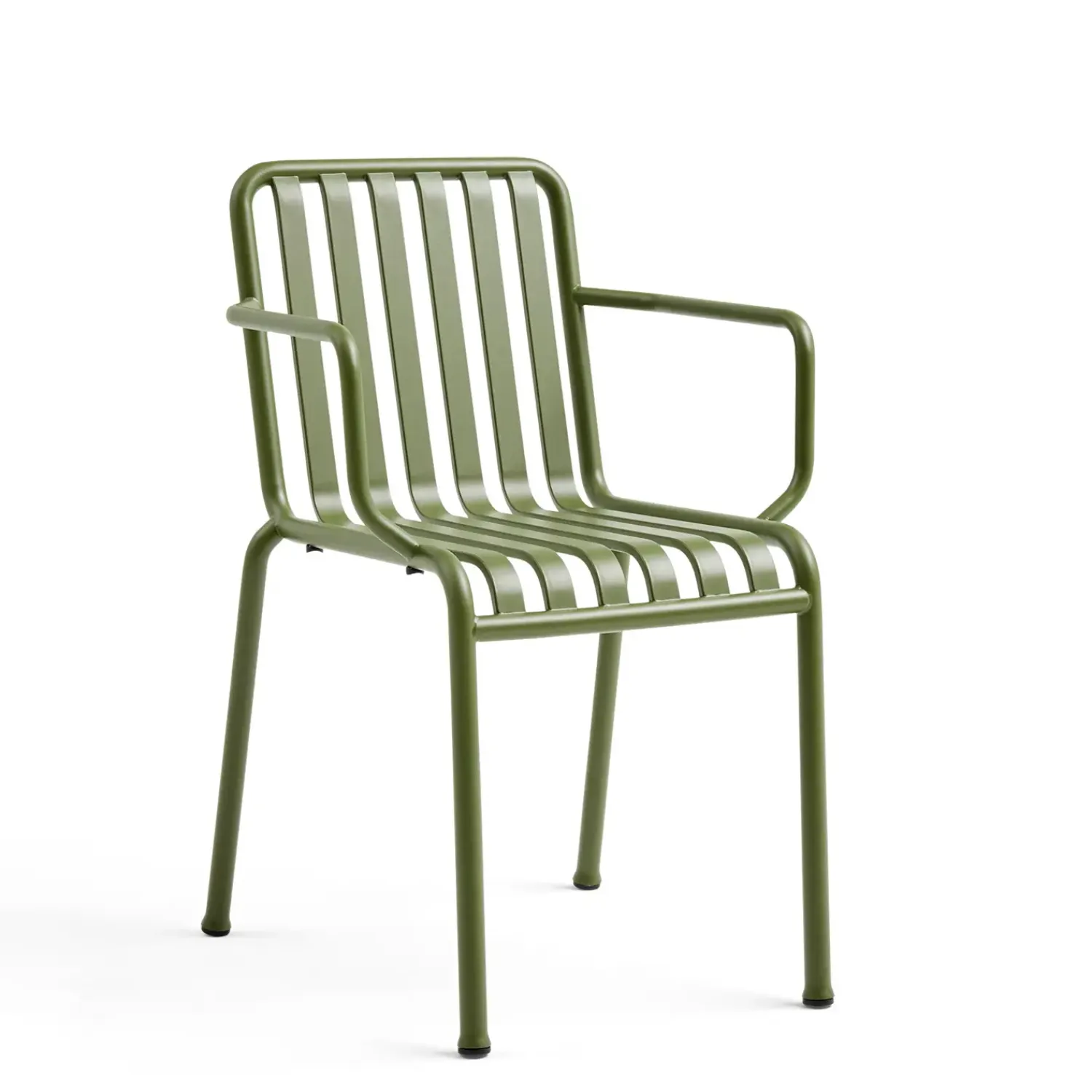 HAY havestol – Palissade armchair er fremstillet af elektrogalvaniseret og pulverlakeret stål, hvilket bidrager til produktets holdbarhed ved udendørs brug. Den olivengrønne farve giver stolen et distinkt udseende. Stolens slatted design med lodrette lameller på ryglæn og sæde har en praktisk funktion, da det tillader ventilation og lader regnvand passere igennem. Dette designelement kan bidrage til at reducere vedligeholdelsesbehovet og potentielt forlænge stolens levetid ved udendørs brug. Stolen er vandtæt, hvilket gør den ideel til alle vejrforhold.