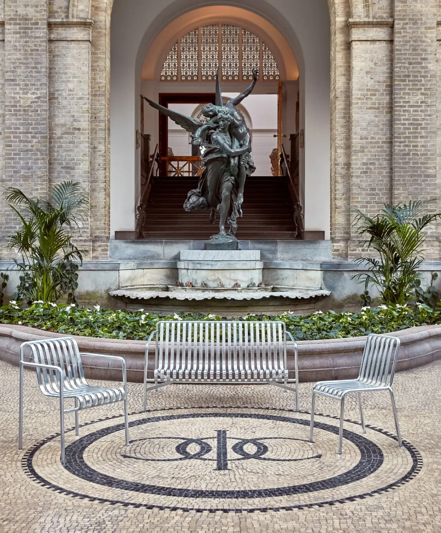 HAY havestol – Palissade Dining Armchair udmærker sig ved sin solide konstruktion i galvaniseret stål. Dette materiale bidrager til stolens holdbarhed og giver den et råt og moderne udtryk. De lodrette stænger i sædet og ryggen er designet til at give støtte og komfort under udendørs sammenkomster. Stolens geometriske linjer og minimalistiske form gør den til et stilrent valg for enhver udendørs indretning, hvad enten det er en privat terrasse eller en offentlig café.