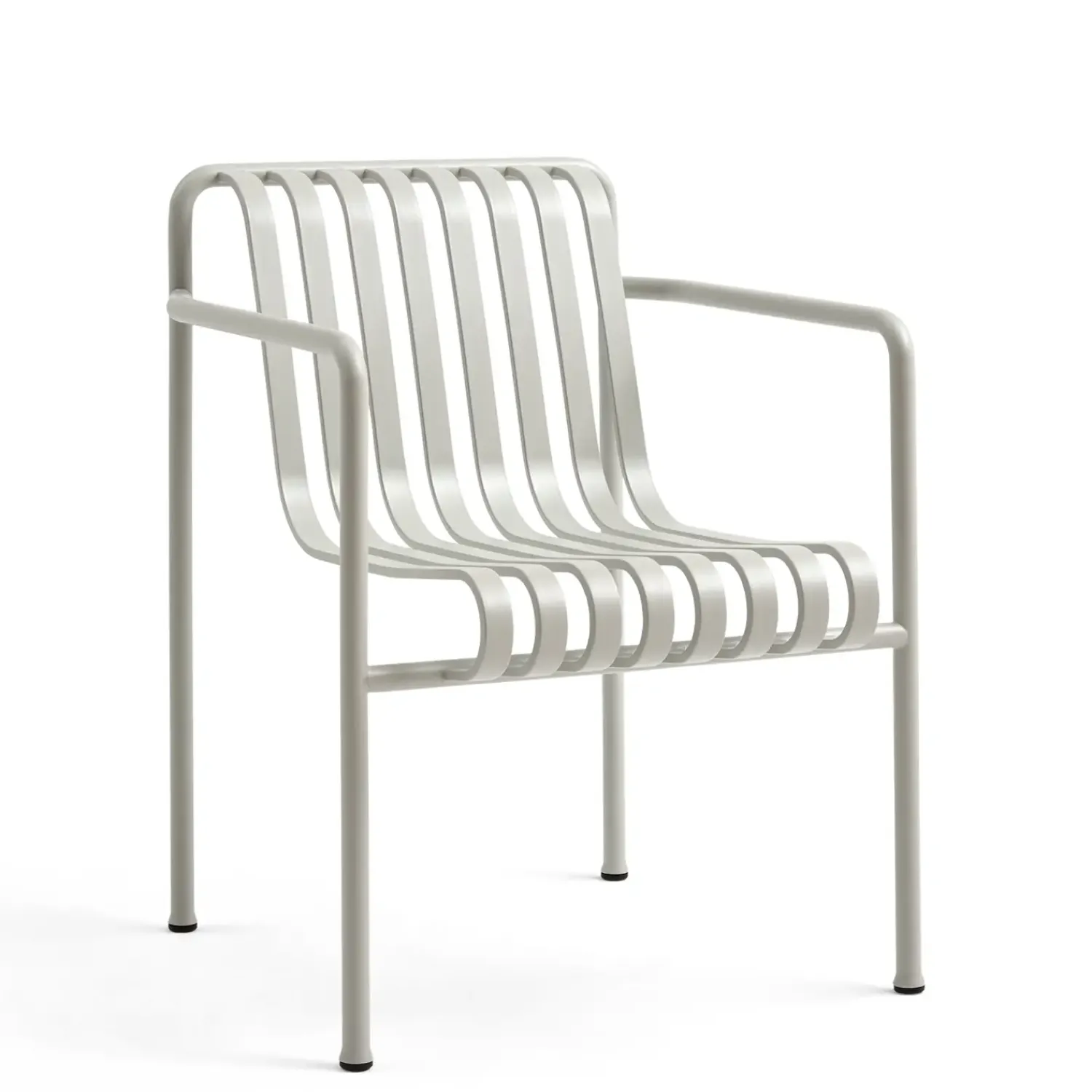 HAY Palissade spisebordsstol har integrerede armstøtter, der er en del af stolens struktur. Denne funktion bidrager til stolens overordnede design og funktionalitet. Stolens ergonomiske udformning er designet til at understøtte ryggen og armene under brug. Den lysegrå farve, også kendt som sky grey, er en neutral tone, der kan passe ind i forskellige udendørs indretninger. Farven er valgt for sin evne til at integrere sig i forskellige udendørs miljøer.