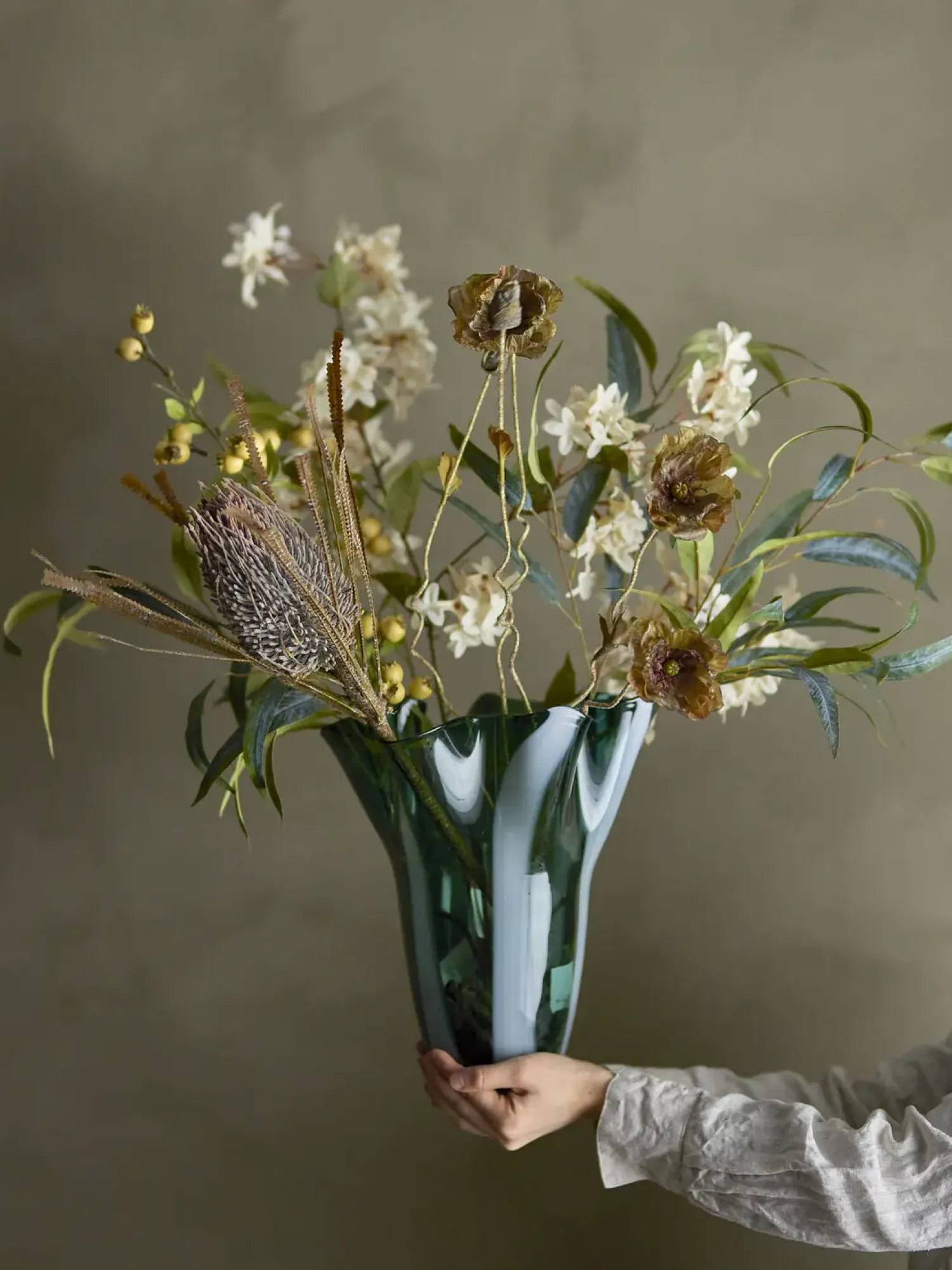 For at sikre det bedste resultat anbefales det at trimme og folde stilkene, inden du placerer grenen. Dette giver dig mulighed for at skabe præcis det udtryk, du ønsker, og samtidig bevare grenens naturlige udseende længst muligt.