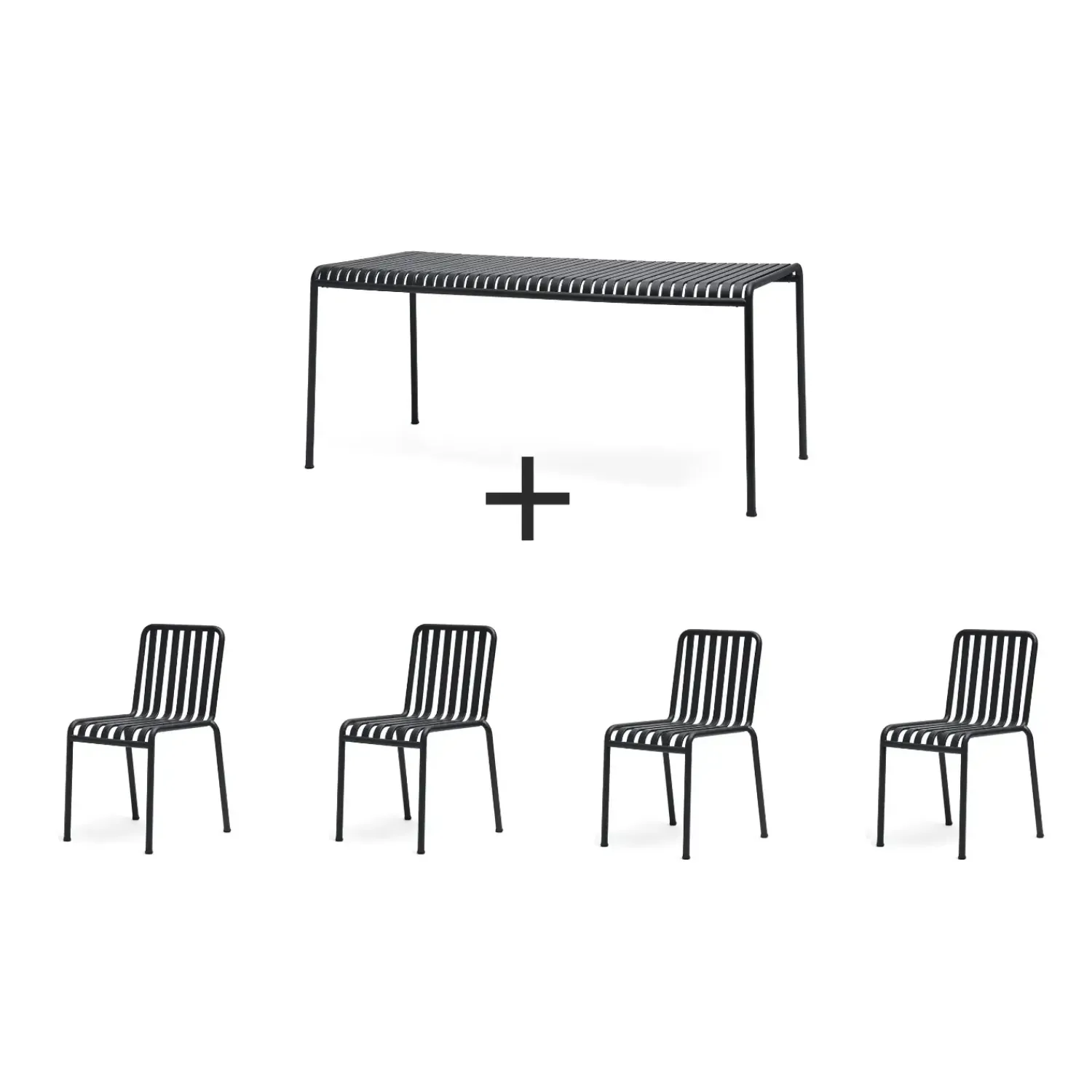 HAY Palissade-sættet tilbyder en praktisk løsning til din udendørs indretning. Dette sæt, bestående af et bord og fire stole i antracitfarve, er designet til at imødekomme behovet for både funktionalitet og æstetik i haven eller på terrassen.