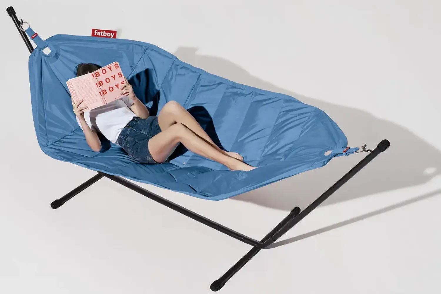 Hængekøjen er lavet af polyester, som er modstandsdygtig over for forskellige vejrforhold. Stativet består af metal og gummi, hvilket giver stabilitet og beskyttelse mod rust. Disse materialer er valgt for at sikre, at hængekøjen kan bruges i flere sæsoner uden at miste sin funktionalitet.