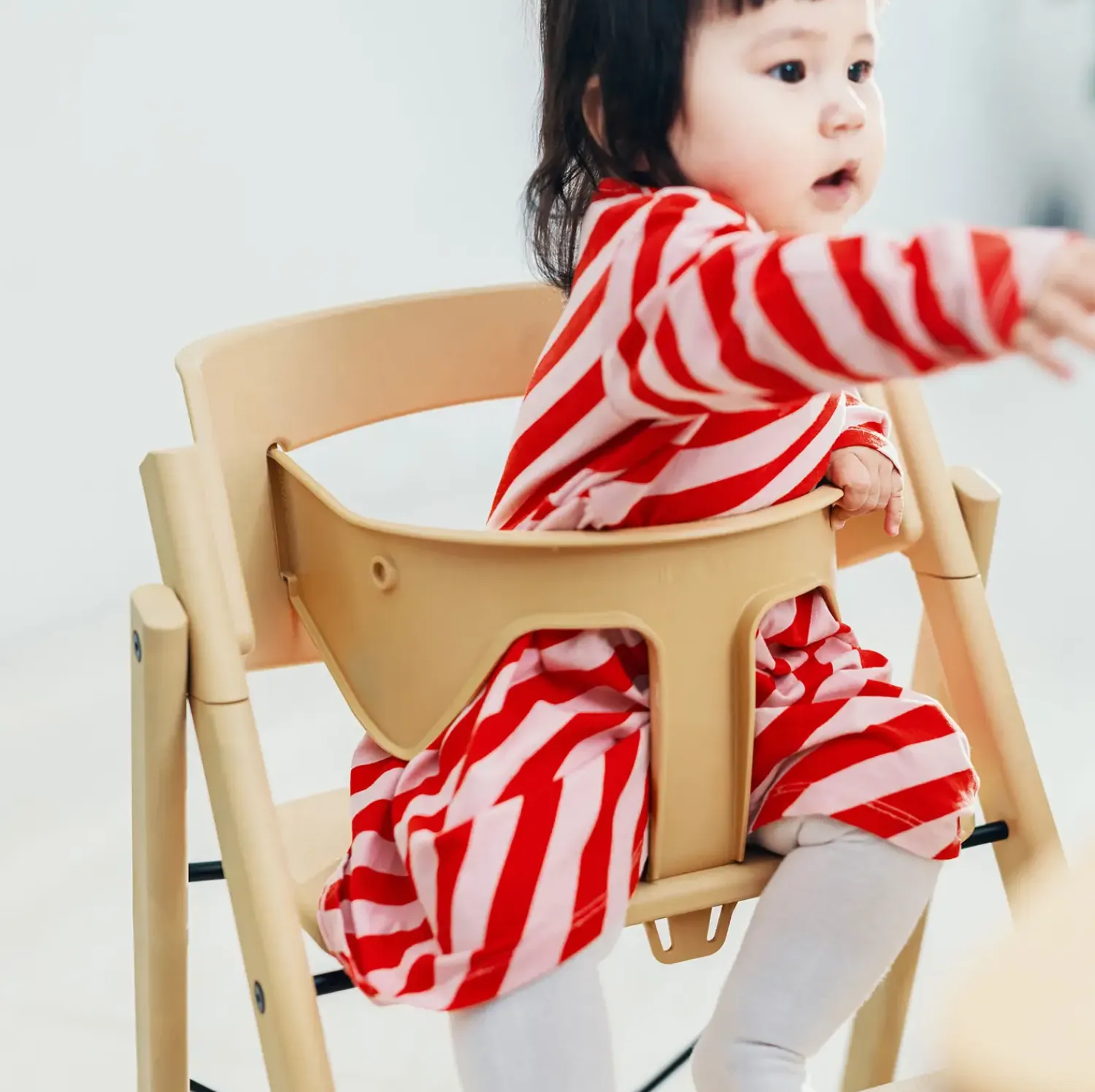 De indbyggede trin gør det trygt for dit barn at klatre op og ned selv. Sædehøjden på 56 cm passer til standard bordhøjder, og den ergonomiske siddestilling sikrer god støtte gennem alle udviklingstrin.