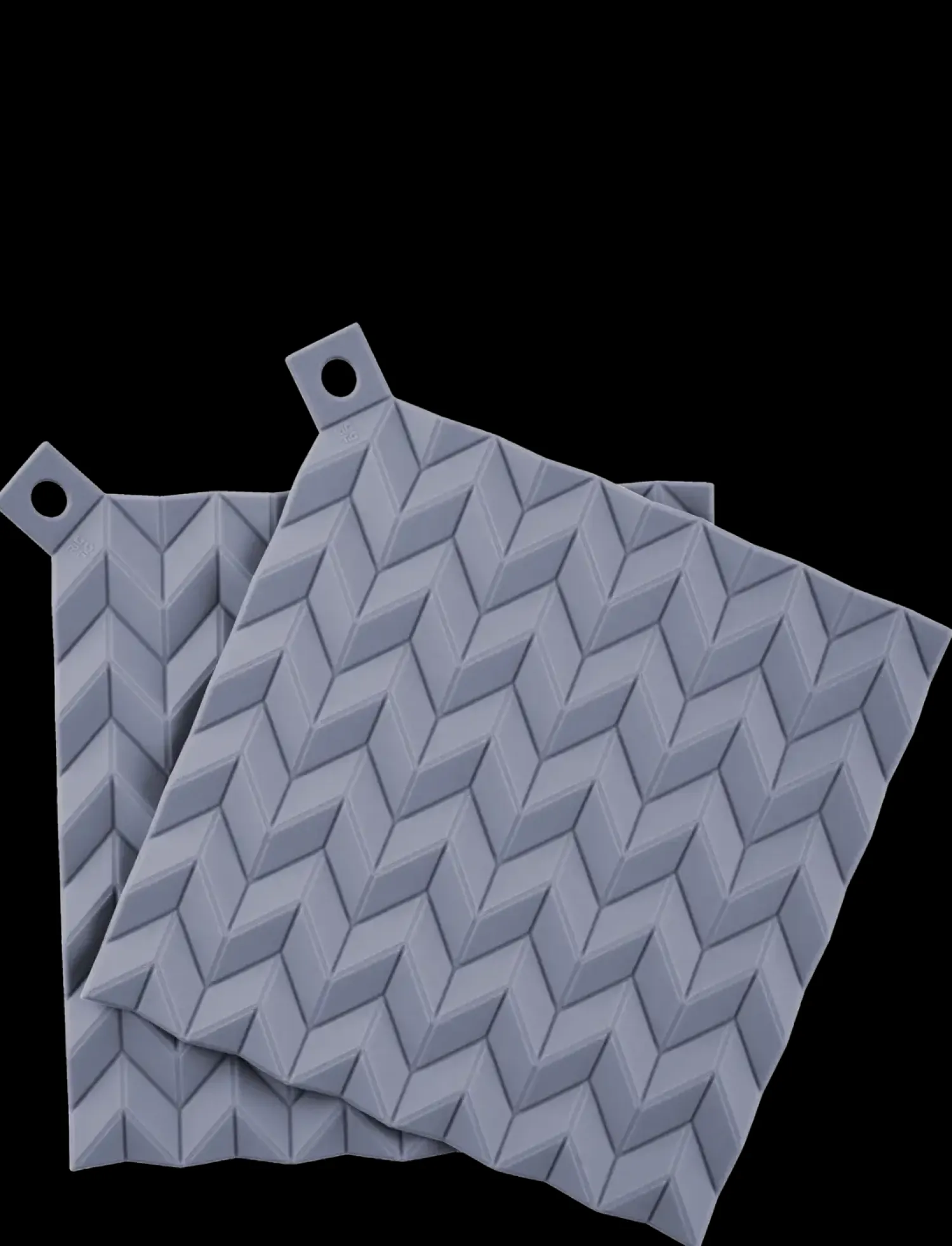 HOLD-ON er moderne grydelapper og bordskånere i ét. De er designet af Søren Refsgaard, der har ladet sig inspirere af den japanske origami foldeteknik. HOLD-ON grydelapper er fremstillet i silikone, der tåler op til 230 °C varme. Undgå at brænde fingrene – grydelappernes struktur sikrer et godt greb om gryderne, og så er de endda mere varmeisolerende end konventionelle stofgrydelapper. Giv dem en tur i opvaskemaskinen, hvis de er blevet fedtede.