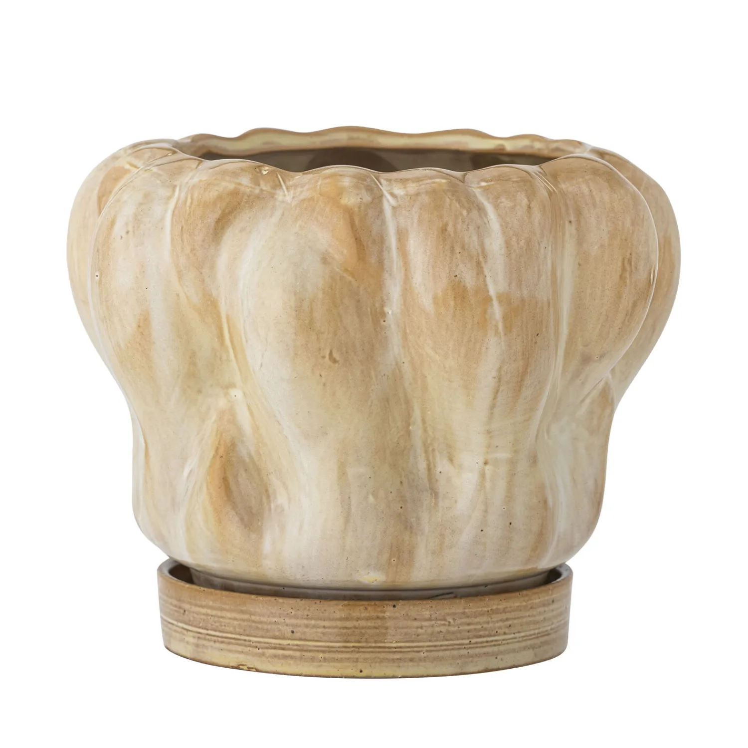 Denne håndlavede urtepotte i stentøj giver dine planter et solidt og holdbart hjem. Med en diameter på 20 cm og en højde på 15,5 cm passer den til mellemstore planter. Den naturlige farve og den skinnende glasur skaber variation i overfladen.