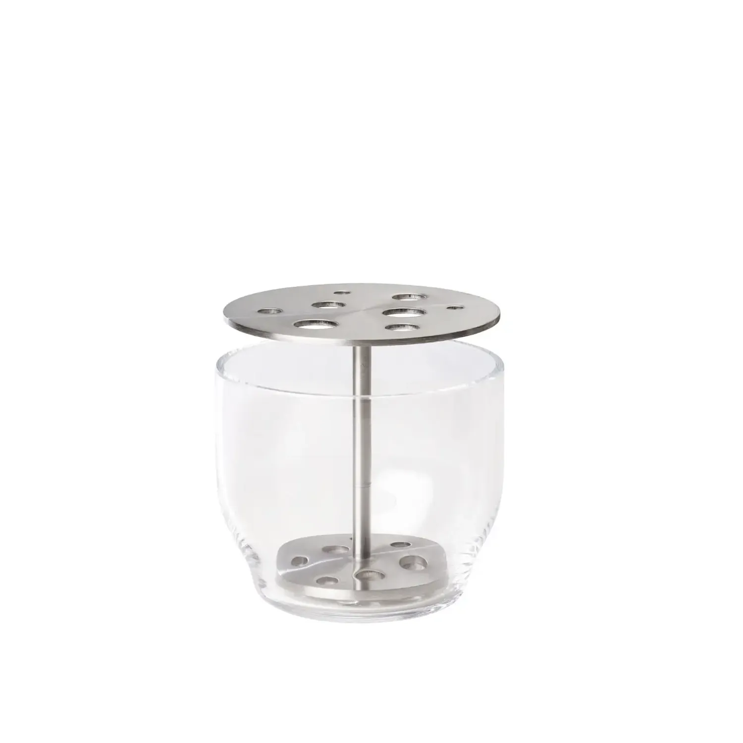 Denne vase kombinerer mundblæst klart glas med rustfrit stål i en kompakt størrelse. Glasset er håndlavet, hvilket giver hver vase en særpræget finish, mens stålet sikrer holdbarhed og modstandsdygtighed. Metalindsatsen med flere huller gør det nemt at placere enkelte blomster præcist.
