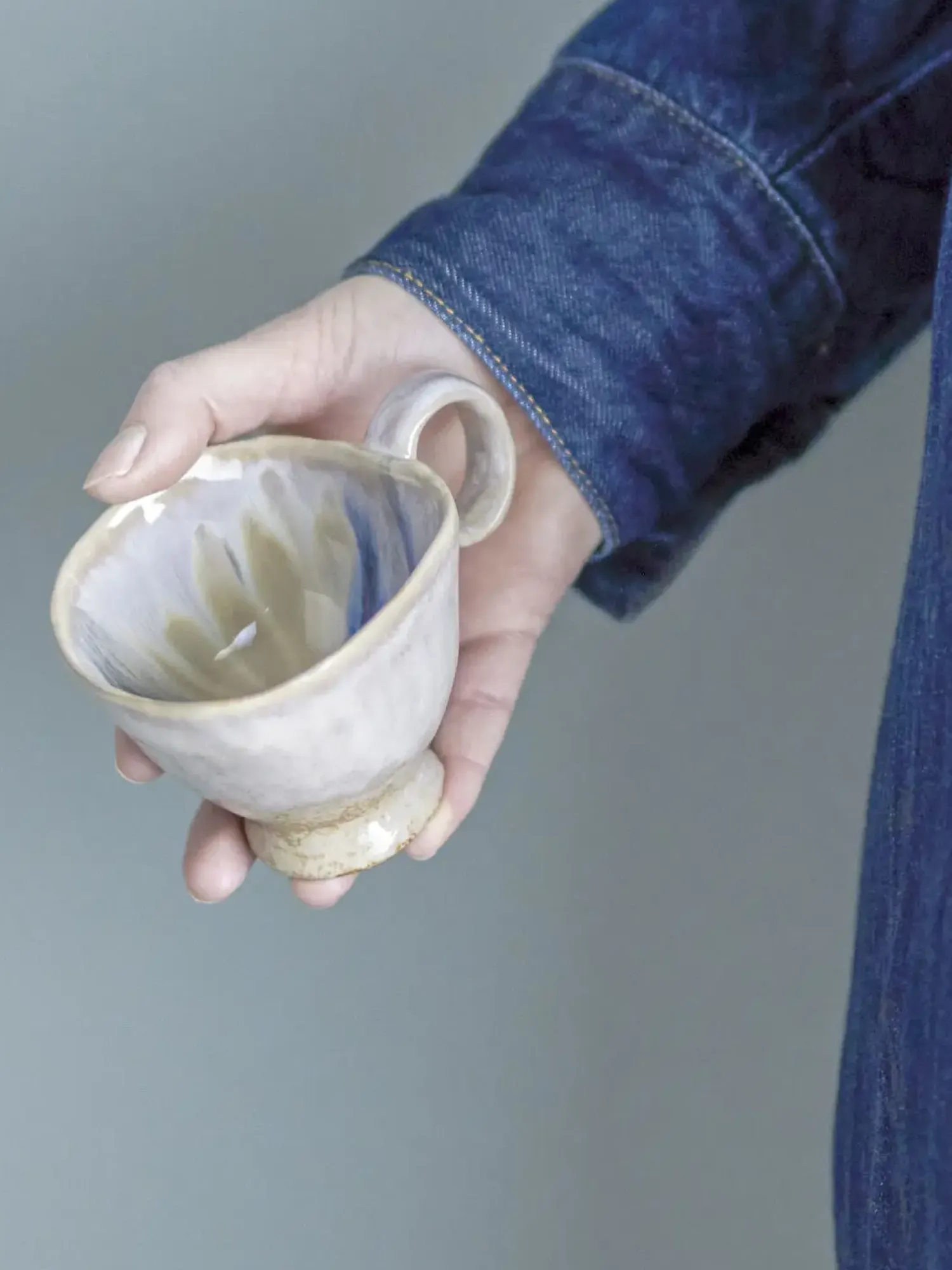 Denne stentøjskop med bølget form og naturlig, ujævn kant giver din daglige kaffestund et særligt præg. Med en rummelig kapacitet på 175 ml og et stort, rundt håndtag ligger koppen godt i hånden.