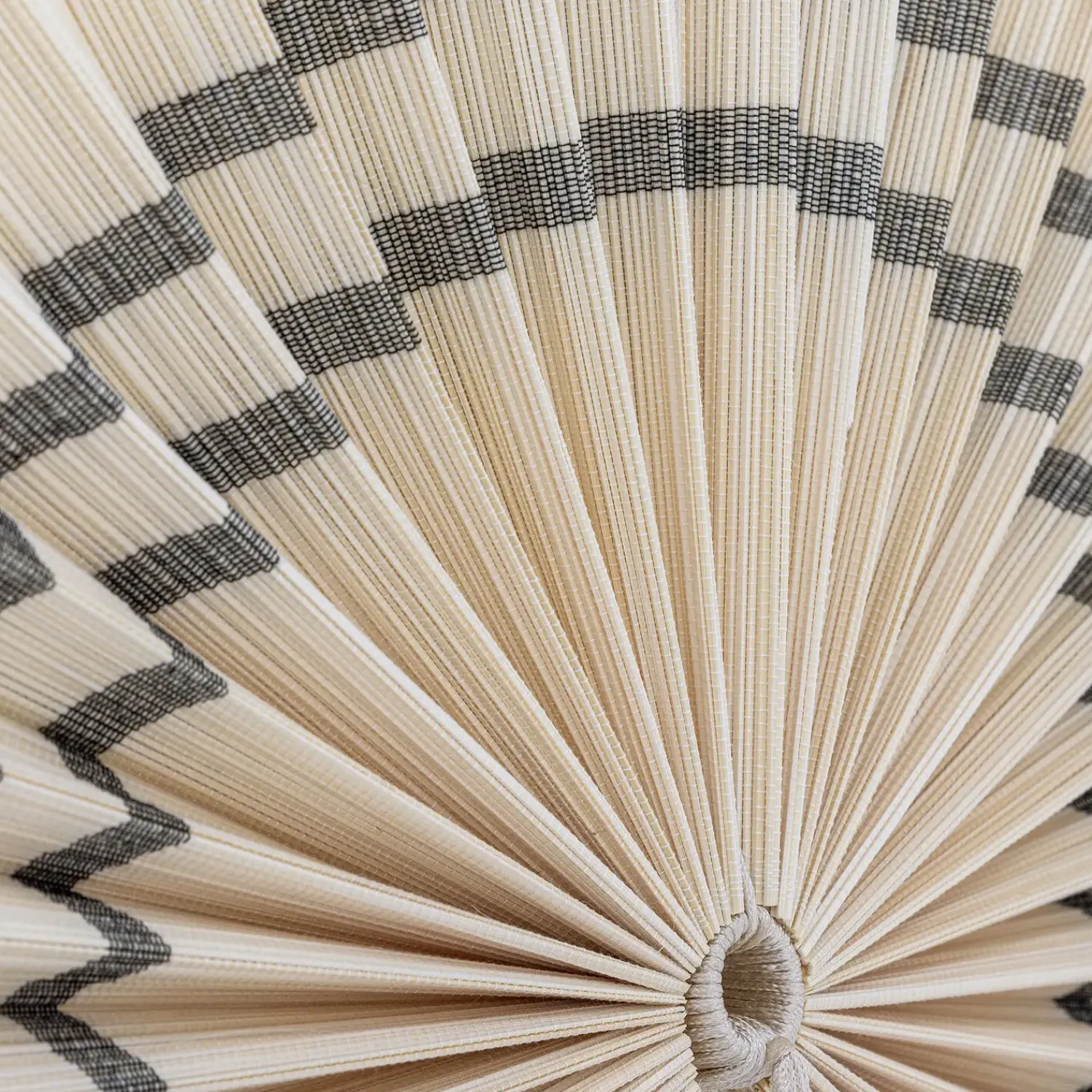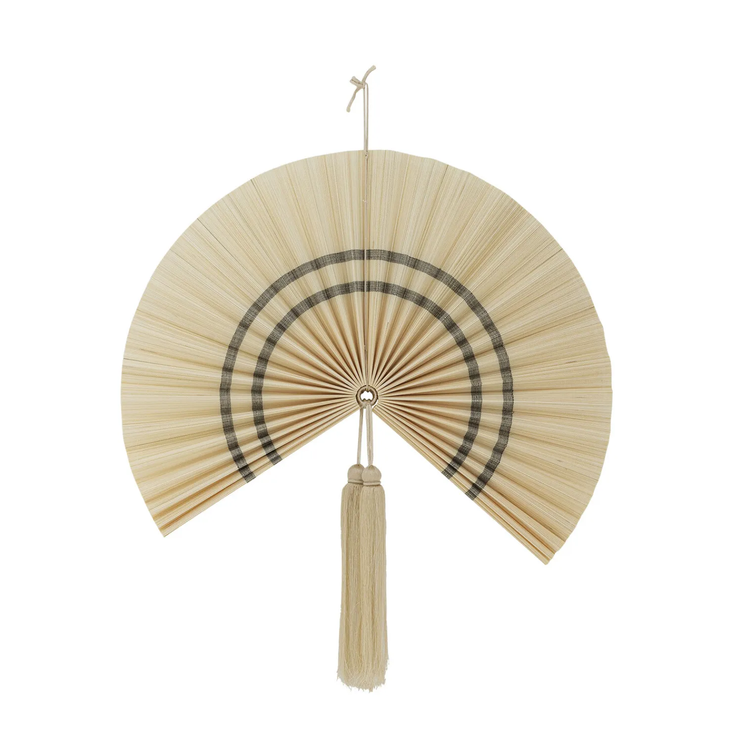 Denne håndlavede vægdekoration i 100% bambus har mørke cirkelmønstre og en dekorativ kvast i bunden. Med mål på 70 cm i bredden og 75 cm i højden skaber den et fokuspunkt på væggen.