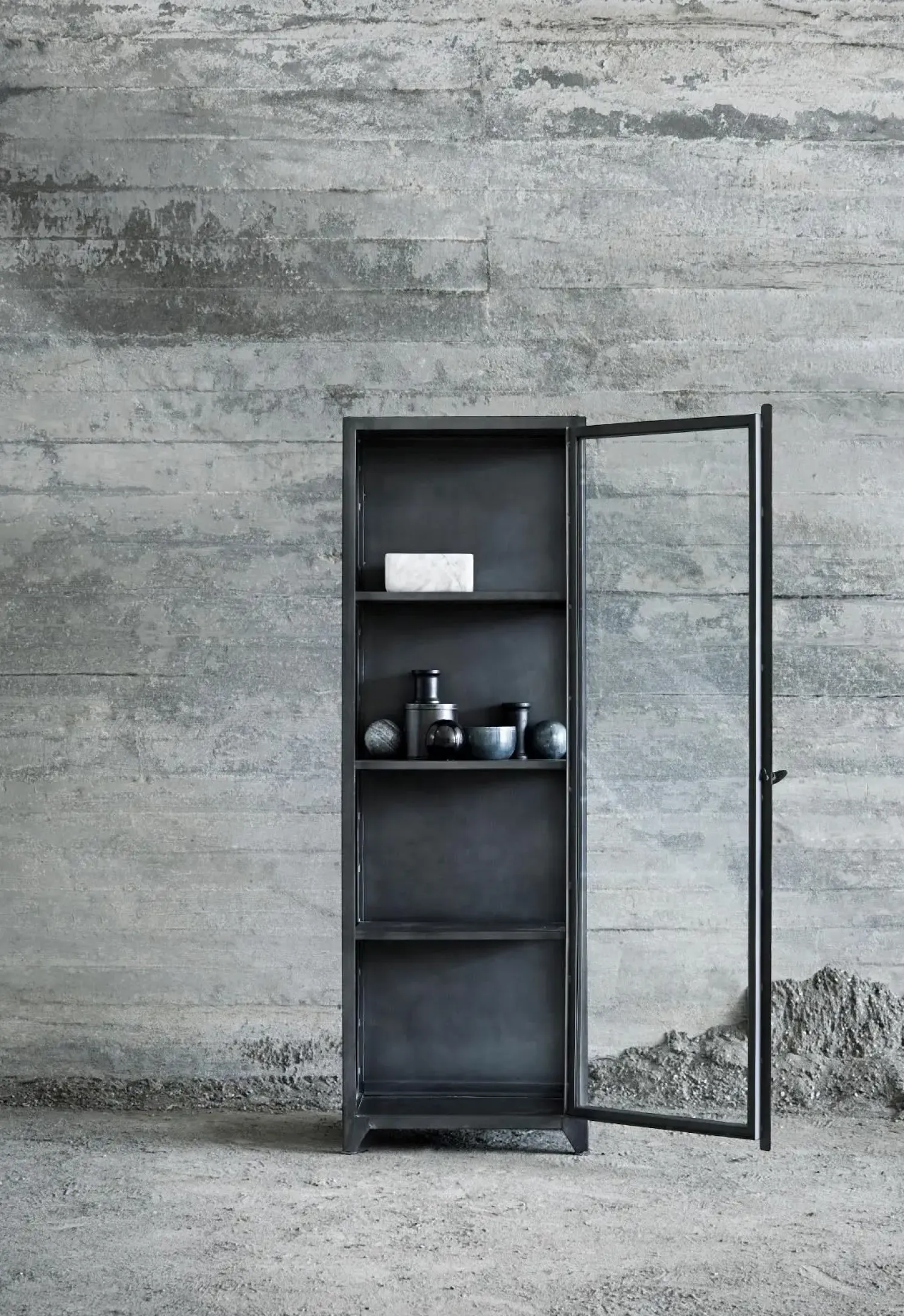 Muubs jernskabene kan variere i farve fra lys antracitgrå til nærmest sort. Farvenuancen kan ændres fra produktion til produktion og afhæning af lyset. Det rå jern har en naturlig mørk nuance og maskulin overflade, som gør hvert enkelt skab til et majestætisk statement i boligen.
