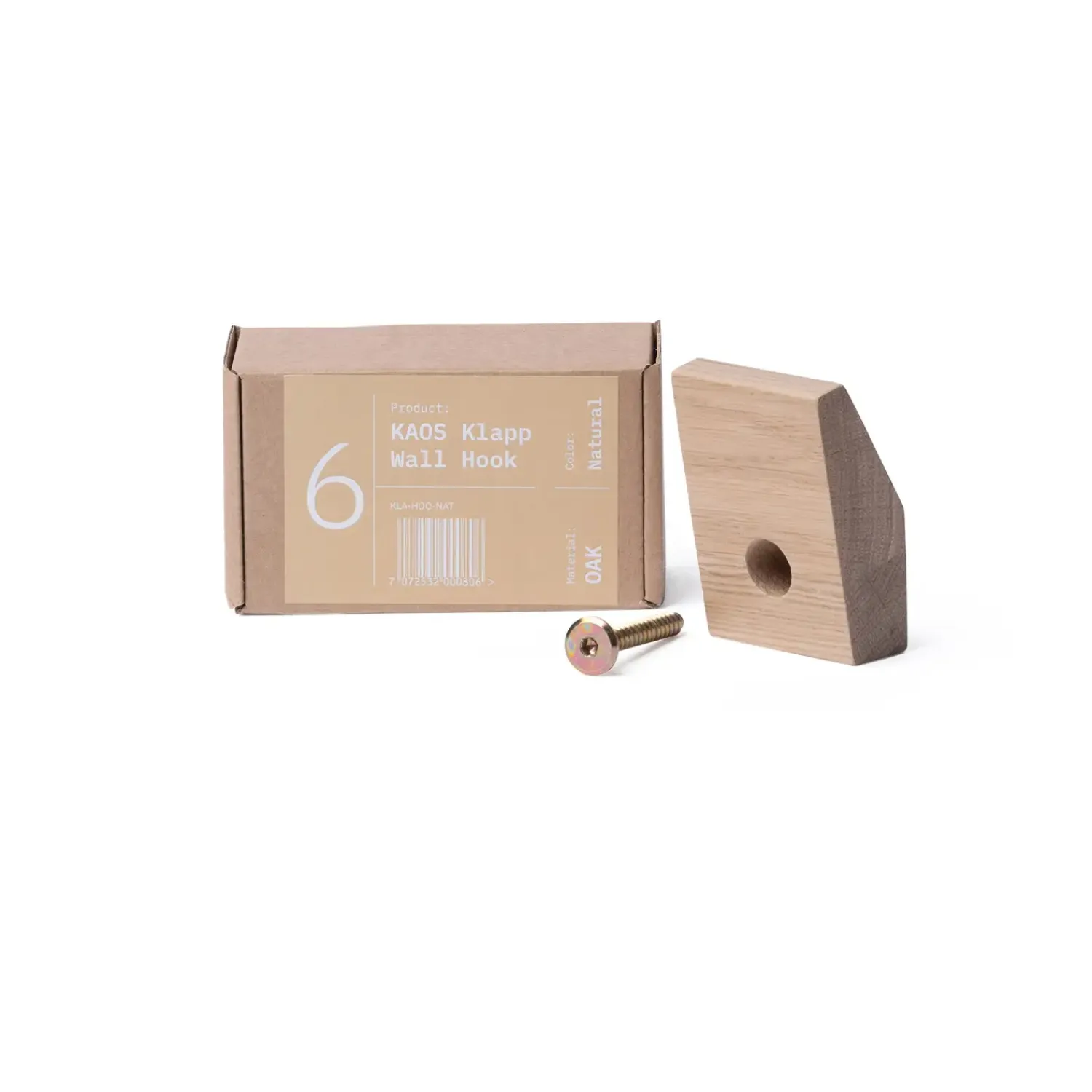 Denne vægkrog i solid eg sikrer sikker opbevaring af din KAOS KLAPP® stol. Den naturlige egefinish giver ikke kun holdbarhed, men bidrager også til et roligt udtryk i hjemmet.