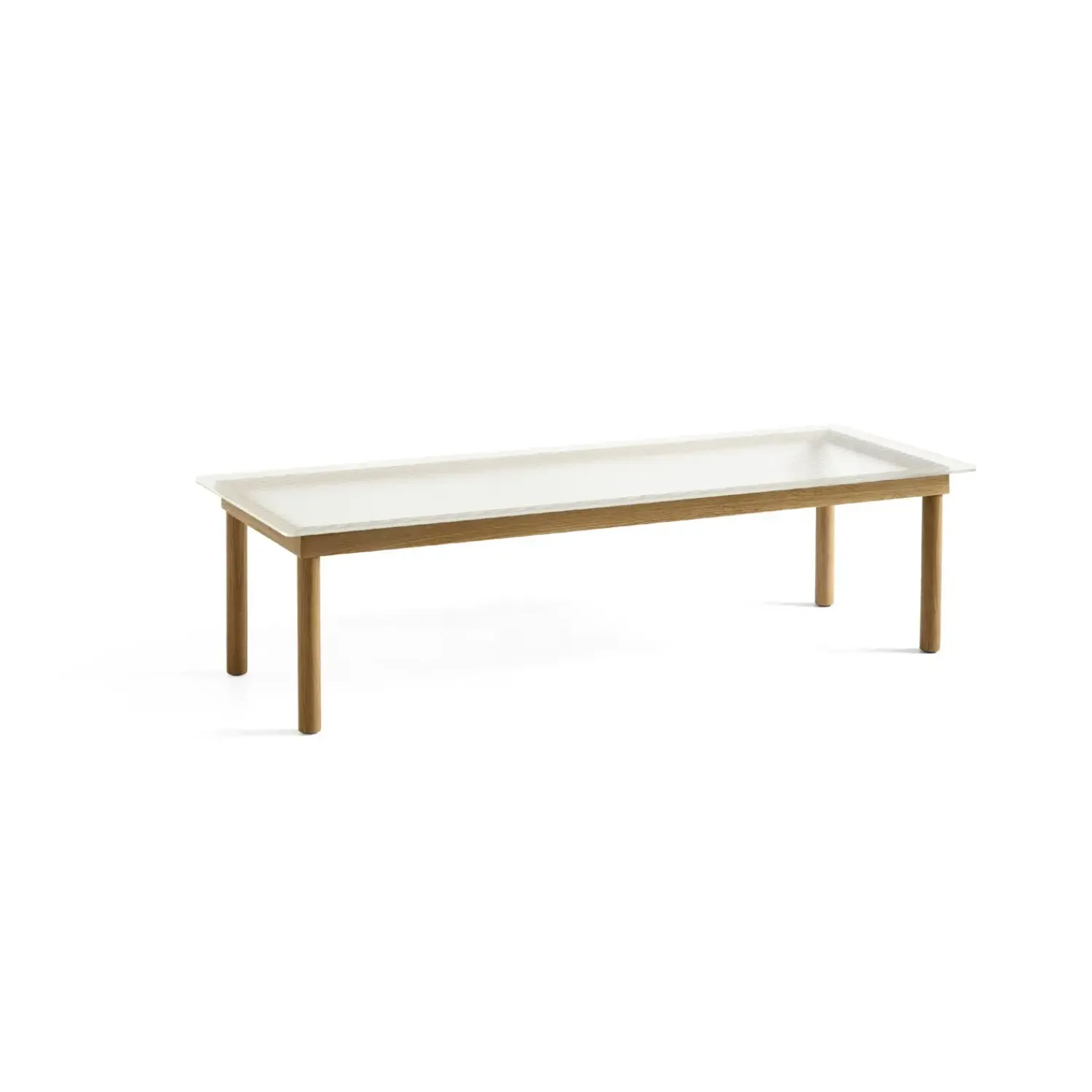 Dette sofabord fra HAY kombinerer funktionalitet med ansvarlig produktion. Basen er fremstillet af FSC-certificeret eg, hvilket understøtter bæredygtig skovdrift. Bordpladen i forstærket glas tilbyder holdbarhed, mens den rillede tekstur giver en karakteristisk overflade. Det måler 140 cm i længden, 50 cm i bredden og 36 cm i højden.