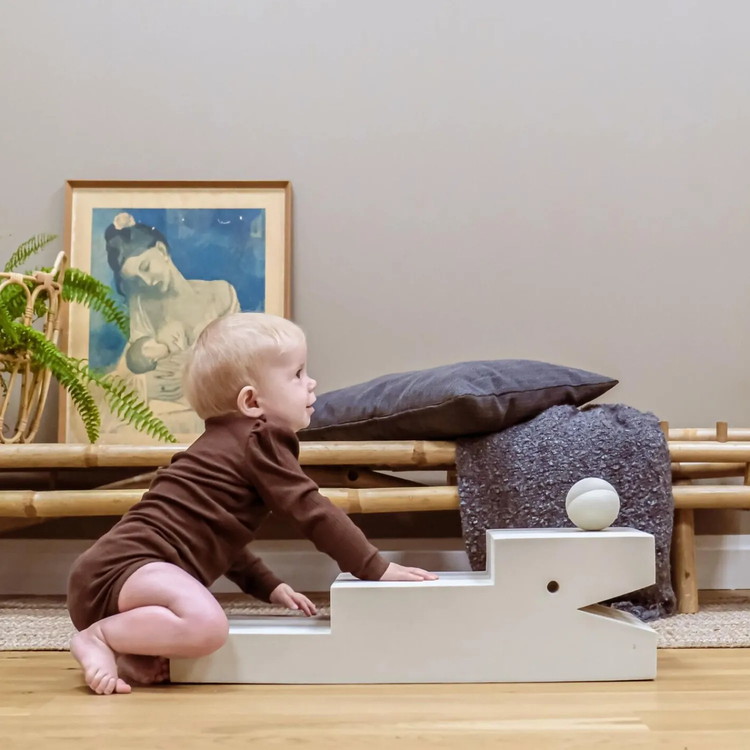 Dette trappeformede legemøbel er designet til at fremme børns motoriske udvikling gennem aktiv leg. Med tre trin i en krokodillelignende profil inviterer det til klatring, balancering og kreativ bevægelse, der styrker koordination og kropsbeherskelse på en naturlig måde.