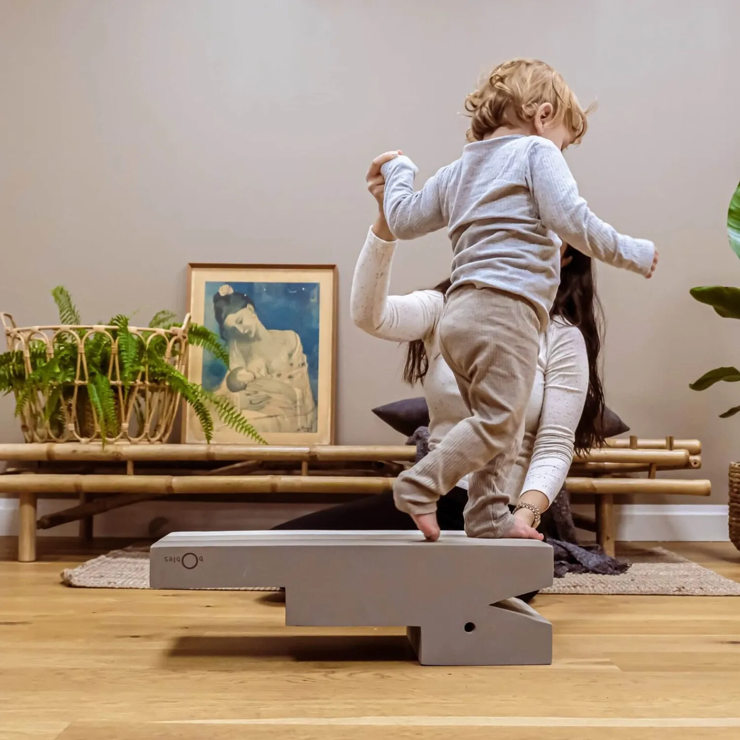 Den krokodillelignende form gør produktet visuelt engagerende for børn, mens den trappeformede struktur giver konkrete udfordringer for motorikken. Det grå materiale er neutralt og holder sin form under aktiv brug, så det kan indgå i leg år efter år.