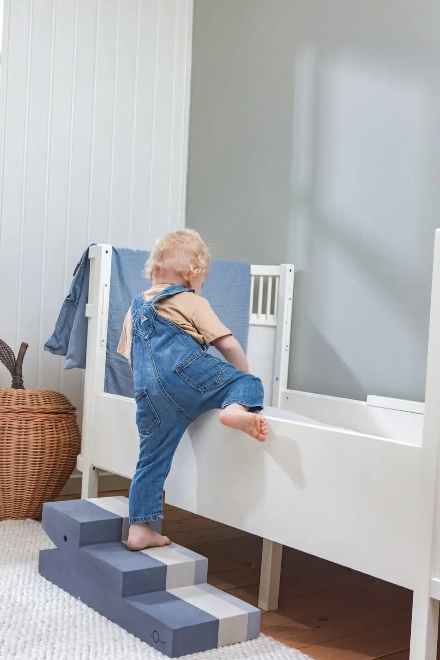 Den krokodilleformede konstruktion med skyblå farve og hvide striber appellerer til børns fantasi. Formen inviterer til aktiv leg, hvor børn kan kravle, balancere eller inddrage den i rollelege. Materialet er designet til at håndtere daglig brug, mens farverne matcher forskellige indretningsstile i børneværelset.