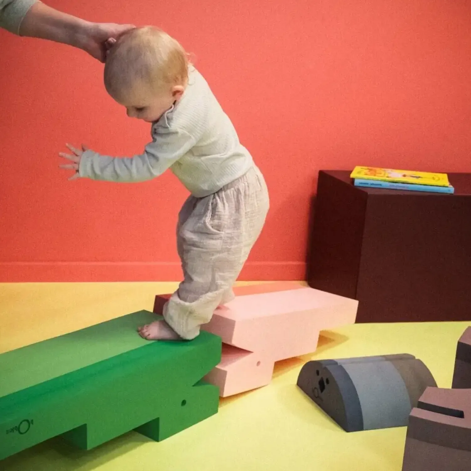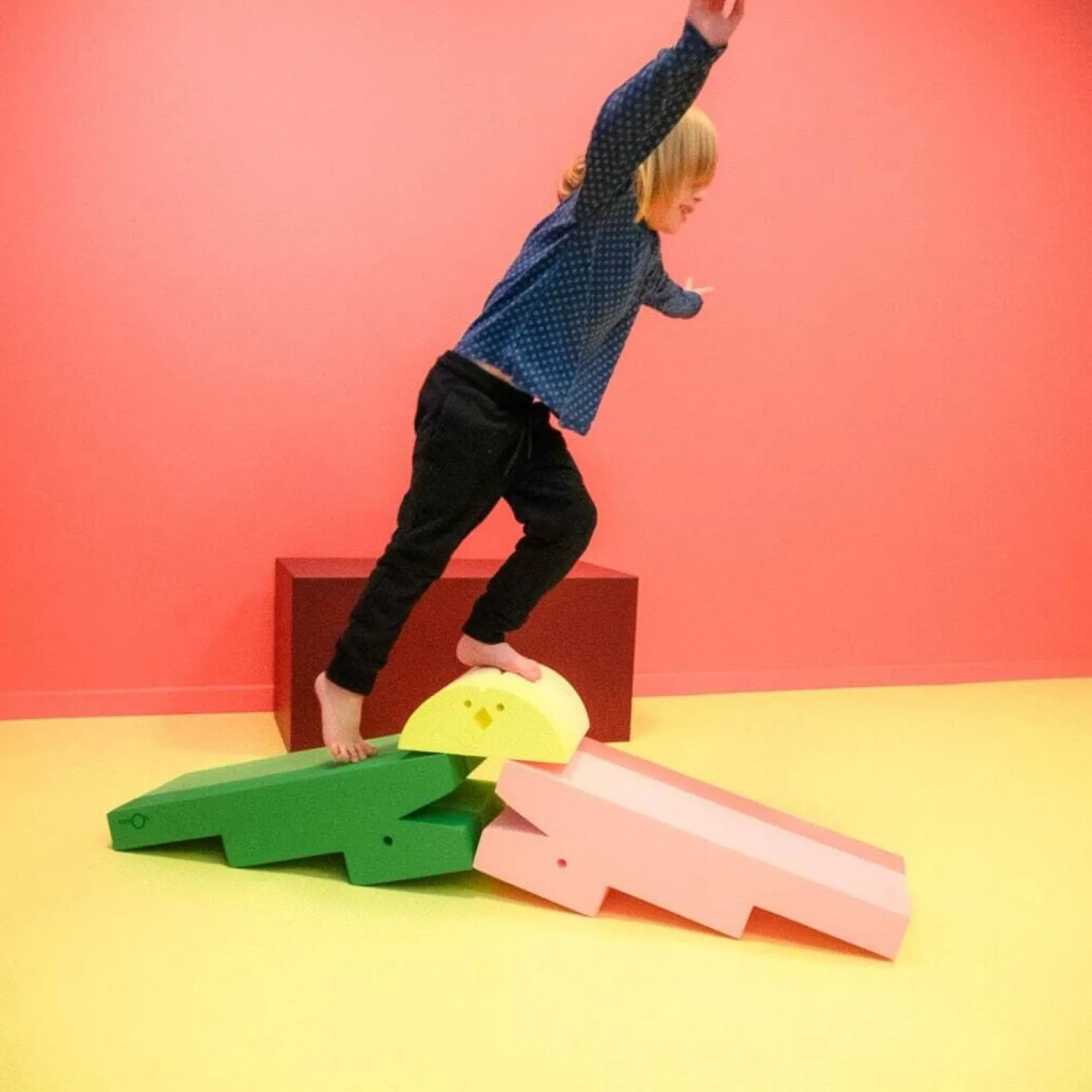 Krokodillen fungerer som en trappe, der hjælper børn med at nå højere niveauer – praktisk når de skal op på sofaen eller kigge ud af vinduet. Den stabile konstruktion giver tryghed, mens barnet lærer at navigere i højden og udvikler selvstændighed i dagligdagen.