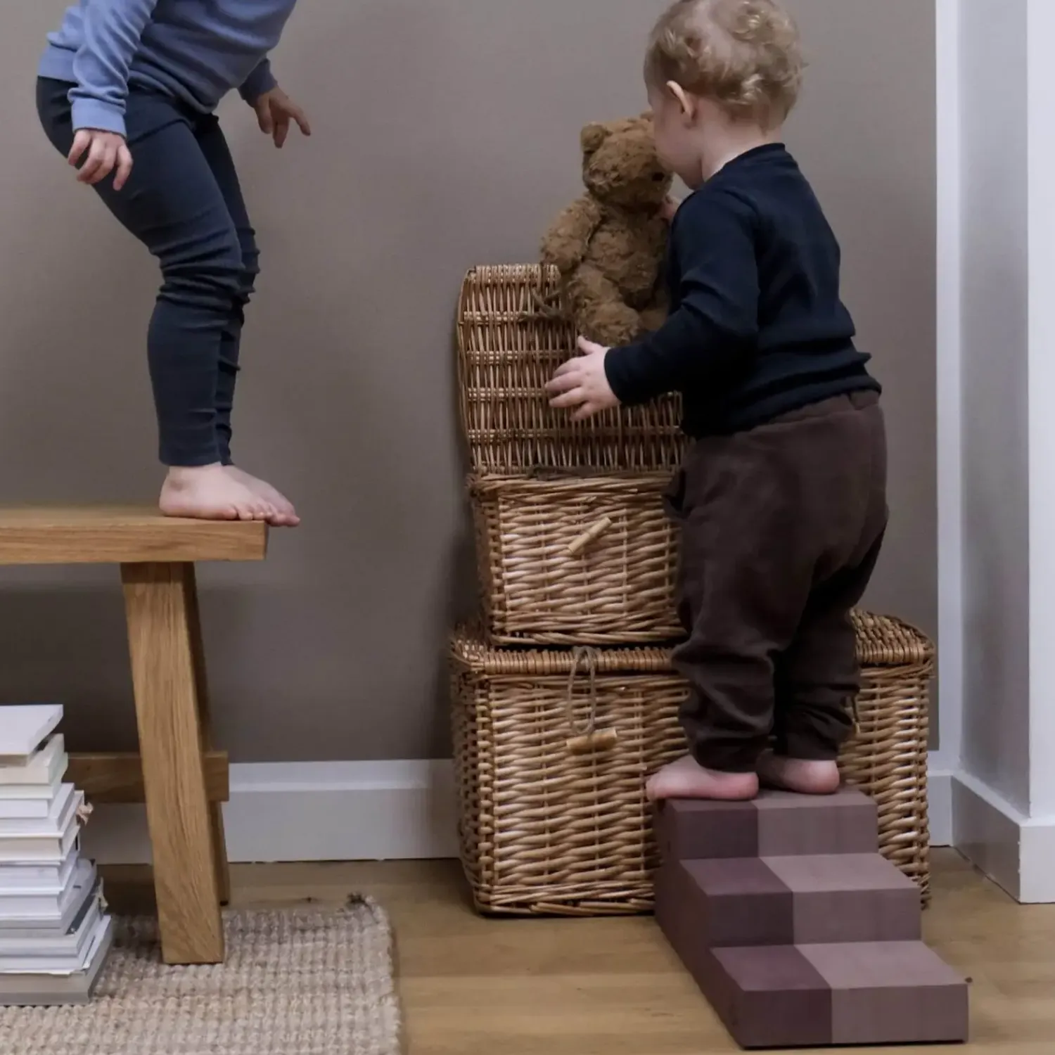 bObles krokodille M er et fantastisk tumlemøbel til børn i alle aldre, og med dets unikke størrelse og smukke farver vil den uden tvivl blive et hit på børneværelset. Der er næppe noget legetøj, der kan konkurrere med en bObles Krokodille, når det gælder balance, koordination og store grin.For den helt lille baby kan Krokodille vendes om på ryggen og bruges som sliske. Herfra kan mor og far nyde nærværet med deres lille ny, når baby ligger på ryggen og kigger op. Læg en bObles Kylling under Krokodille og pludselig har du den sjoveste baby-vippe.For de kravlende babyer er trinene på Krokodille den perfekte første trappe, hvor der også kan trænes faldrefleks.De sjove aktiviteter stopper dog ikke her. Trappen bliver kun endnu mere underholdende, når tumlingen er kommet op at gå. Sæt den for enden af sengen som hjælp til selv at komme op – det styrker barnets selvtillid at mestre den slags discipliner, ligesom bObles Krokodille pynter i ethvert børneværelse med sit ikoniske og sjove design. Og når barnet bliver rigtig modigt, kan to Krokodiller blive til stylter eller en lille bænk. De naturlige farver er omhyggeligt udvalgt, for at skabe rolige, sanselige og inspirerende omgivelser for barnet at lege i, samtidig med at farverne, såvel som tumlemøblerne er tidløse og kan holde til mere end én sæson.
