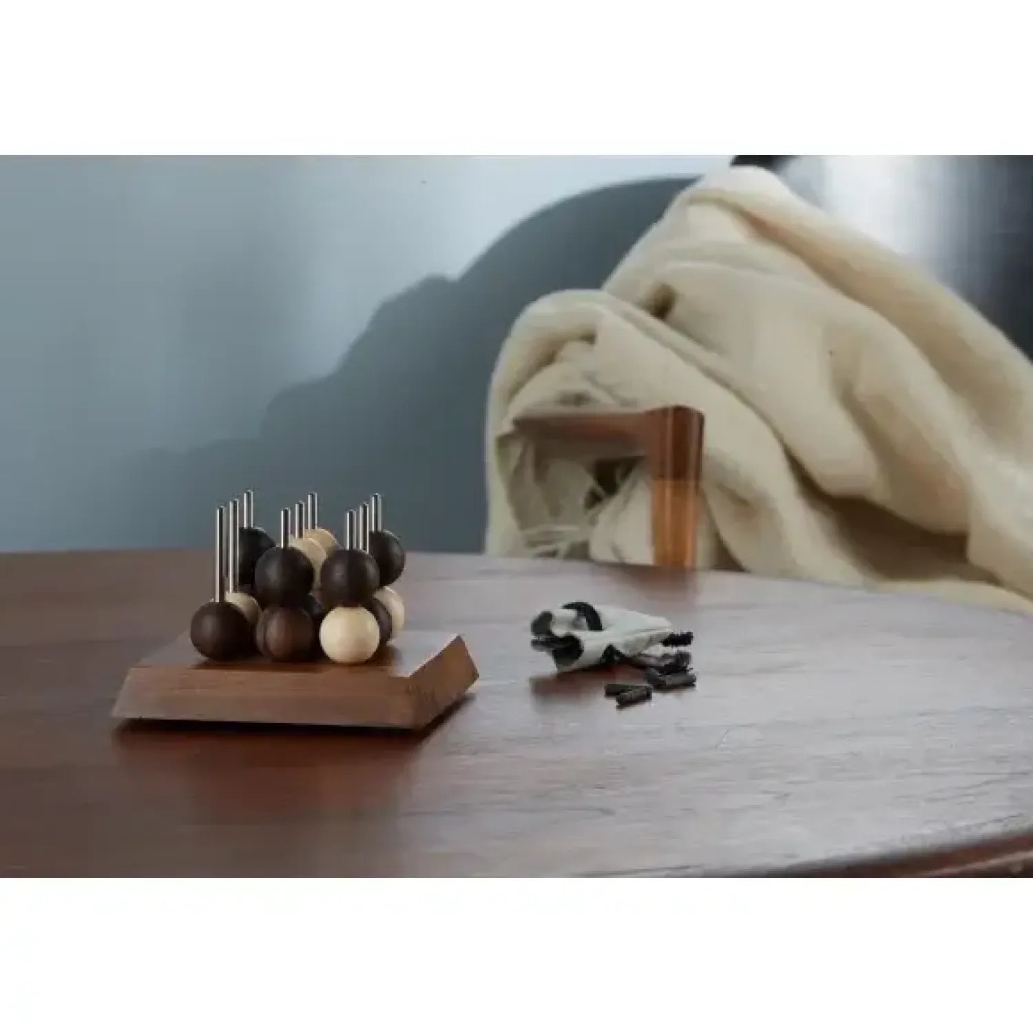 Spilleregler. Et strategisk spil for 2 deltagere, som skiftevis skal anbringe deres kugler og forsøge at få 3 af egne farver i række, vandret, lodret eller diagonalt. Den spiller, der flest gange kan lave en sådan kombination, er vinder. Regnskab føres ved hjælp af de sorte pinde. Der trækkes lod mellem spillerne om, hvem der skal begynde spillet. Hver spiller starter med 13 kugler. Den røde kugle (kamæleonkuglen) afgives til modparten af den spiller, der besætter centerfeltet, d.v.s. den midterste plads på den midterste stang. Denne placering, har stor strategisk betydning,idet den giver flere kombinationsmuligheder end nogen anden placering. Modparten kompenseres med nu at disponere over 14 kugler. Kamæleonkuglen, som anbringes sidst af samtlige kugler, har den egenskab, at den udover at gælde som spillerens egen farve yderligere giver indehaveren ret til point, hvis den ved sin placering færdiggør en række, hvor modstanderen har placeret 2 af sine kugler. Materialer. Baseplate Afromosia / afrikansk teak (latin: Pericopsis elata) Pinde i baseplate Rustfrit stål, syrefast (AISI 316) Kugler Hvide: Vakuumtørret Ahorn, Mørke: Mose-Eg (fremstillet), Rød: Vakuumtørret Ahorn Point-pinde Mose-Eg (fremstillet)