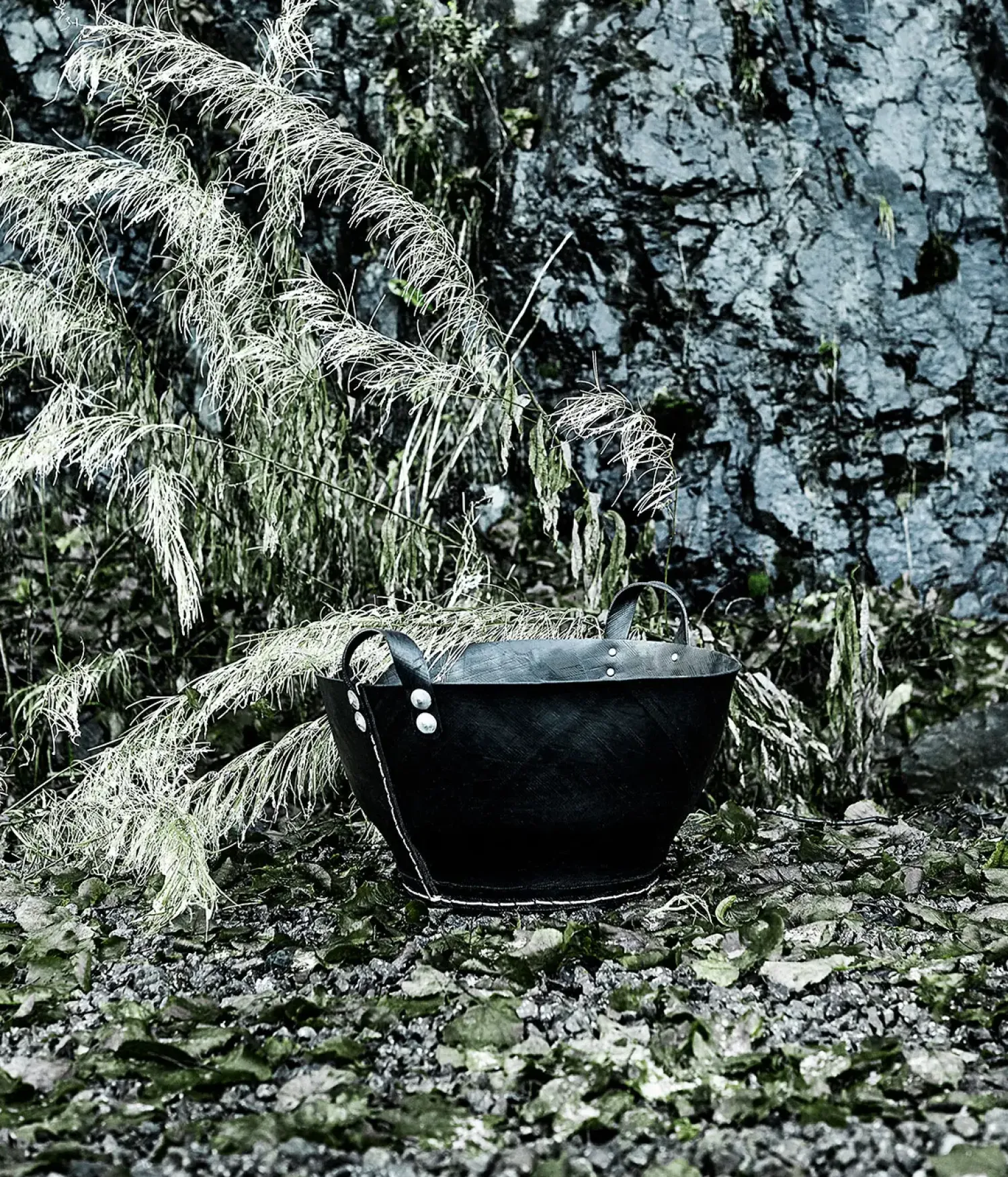 Muubs – Kurv Dacarr udmærker sig ved sin robuste konstruktion og særlige materialevalg. Fremstillet af upcyclede bildæk tilbyder kurven en ekstremt slidstærk kvalitet og en distinkt industriel æstetik. De synlige syningsdetaljer på siderne og metalnitterne, der fastgør håndtagene, understreger det rå og autentiske udtryk. Den tilspidsede cylindriske form sikrer ikke kun et interessant visuelt element, men bidrager også til kurvens funktionalitet.