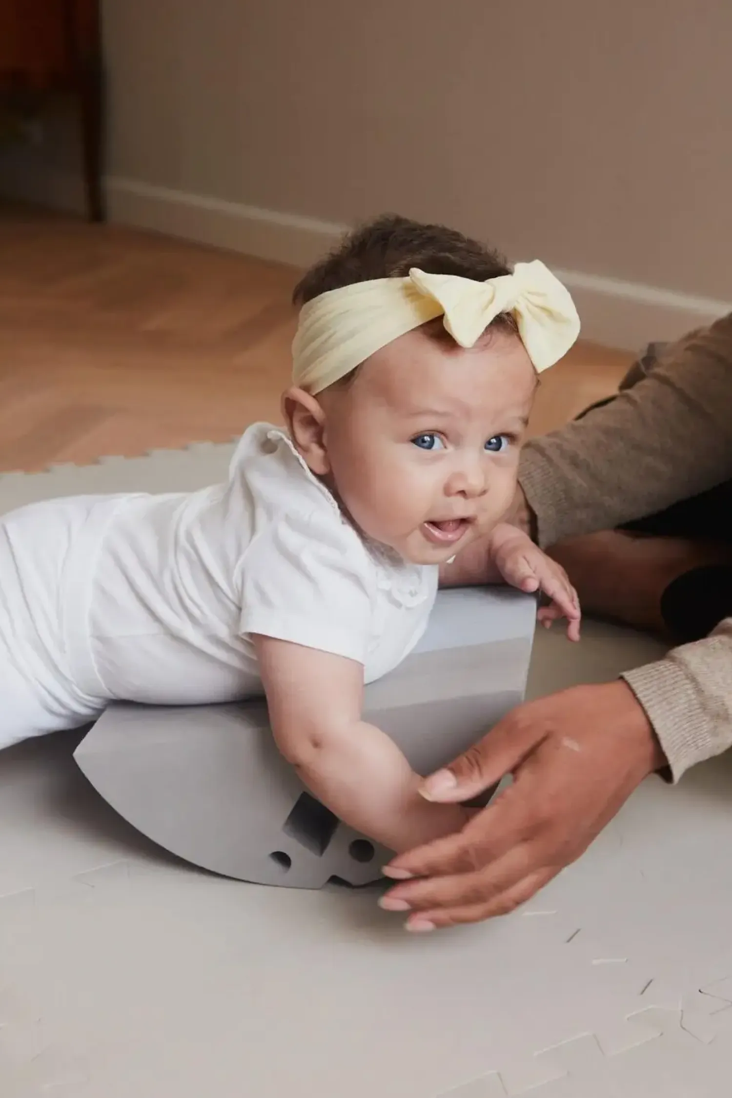 Den buede form kræver, at dit barn konstant justerer sin kropsholdning, hvilket naturligt styrker nakke- og rygmusklerne. Både siddende og stående øvelser er mulige, så produktet vokser med dit barns færdigheder. De naturlige, tidløse farver i blå og grå nuancer passer ind i de fleste børneværelser.