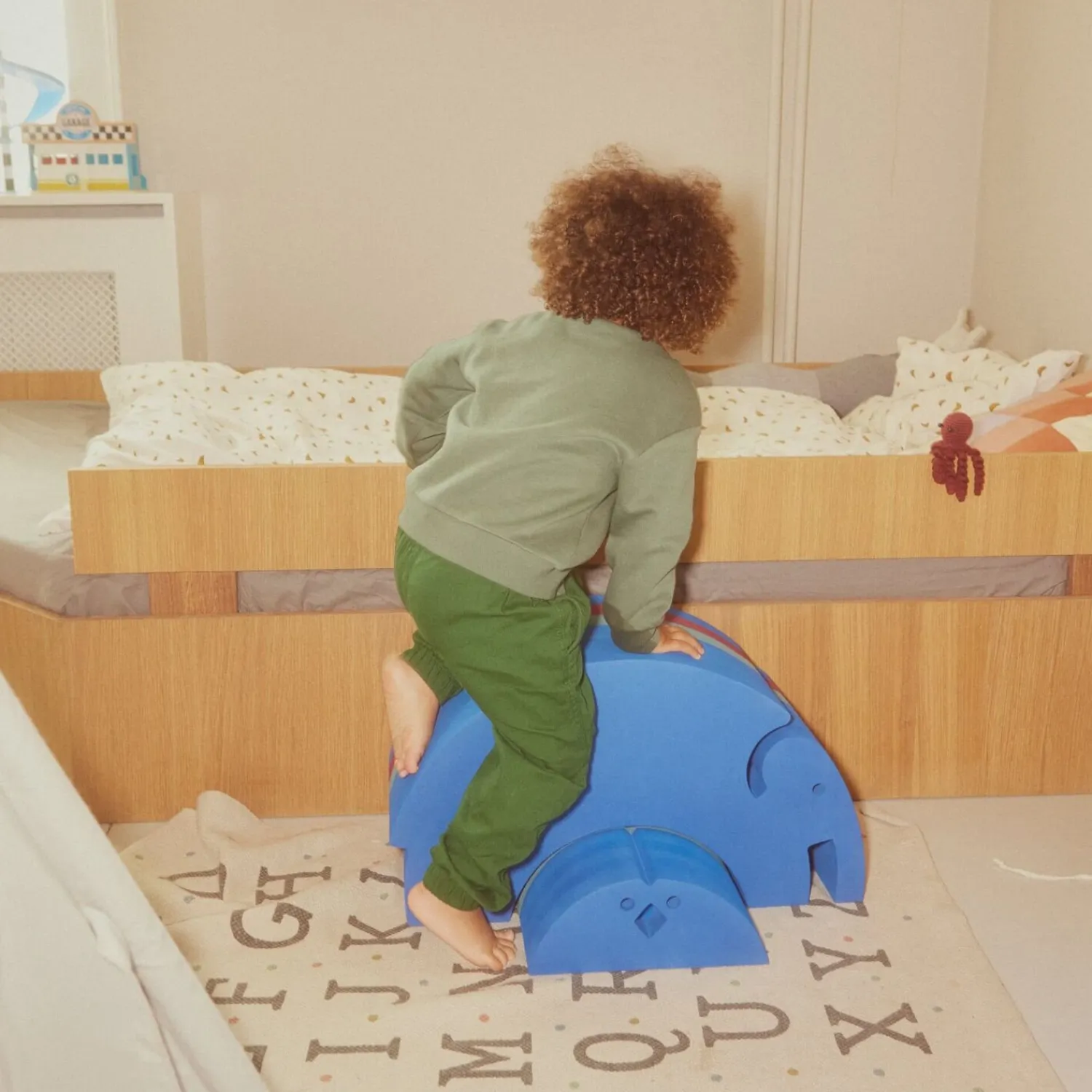 Kyllings buede overflade kan bruges som sliske, når baby skal styrke nakke og ryg. Den passer ind i maven på den store bObles Elefant, og sammen kan de bruges som en vippe, der styrker vestibulærsansen. Når barnet rammer tumlingealderen og begynder at sidde selv er Kylling fantastisk til at øve det kontrollerede vip. Tumlingen kan sidde på Kylling og vippe frem og tilbage eller fra side til side med begge fødder i gulvet. Når barnet er blevet sikker på benene kan bObles Kylling bruges til at vippe stående. Prøv også på kun et ben! Forældrene kan også bruge Kyllingen til at balancere på, f.eks. mens de laver mad eller ser TV. Balancen bør udfordres hele livet! Farverne i vores nye bObles Gym finder inspiration i den energi og bevægelsesfrihed børnene oplever i gymnastiksalen. Produkterne er designet til sjove og stimulerende aktiviteter, så forældre kan skabe en legende og aktiv atmosfære indendørs. Sæt energien fri i hjemmet med vores nye farvepalet for efterår/vinter 23/24. Lad aldrig et øjeblik med regn, vind eller begrænset plads sætte en stopper for din evne til at bevæge og udvikle dig. Med bObles starter eventyret i hjemmet. Press play på legen!