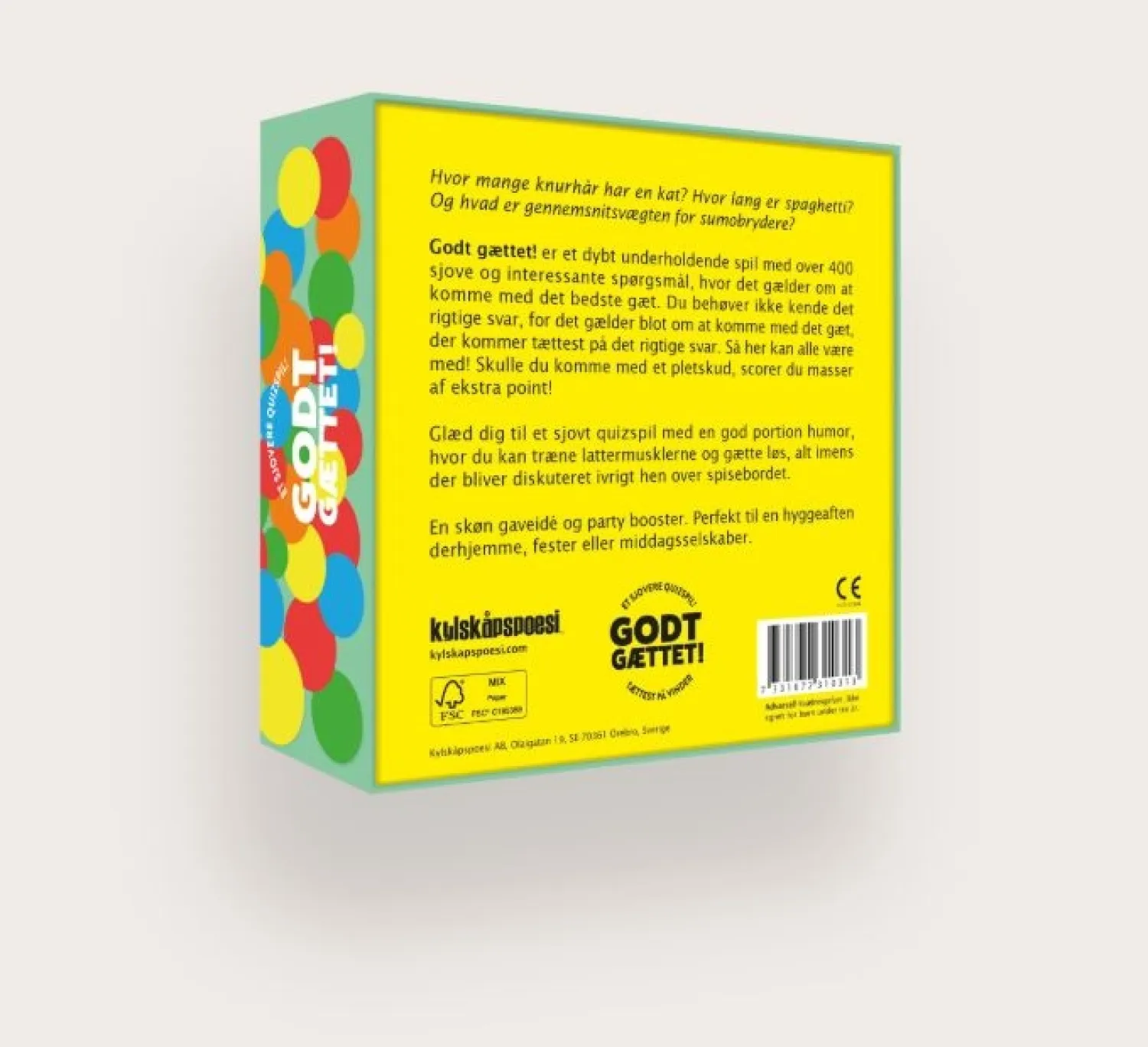 Godt gættet! er et dybt underholdende spil med over 400 sjove og interessante spørgsmål, hvor det gælder om at komme med det bedste gæt. Du behøver ikke kende det rigtige svar, for det gælder blot om at komme med det gæt, der kommer tættest på det rigtige svar. Så her kan alle være med! Skulle du komme med et pletskud, scorer du masser af ekstra point!