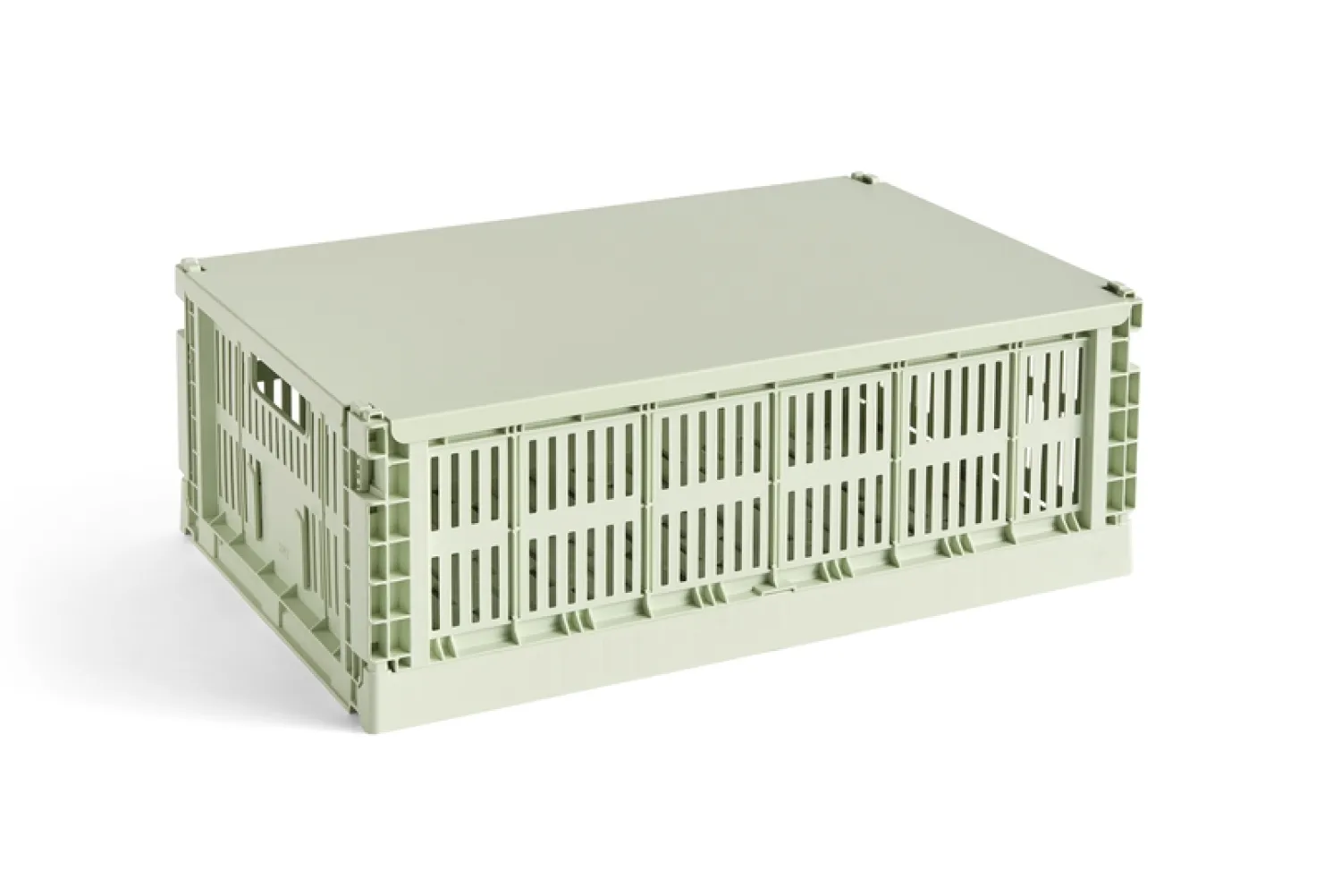 Dette låg er fremstillet af 100 % genanvendt plastaffald og passer præcist til din HAY Colour foldekasse i large-størrelsen. Med sin mintfarvede finish beskytter låget effektivt kassens indhold og kan bruges igen og igen.