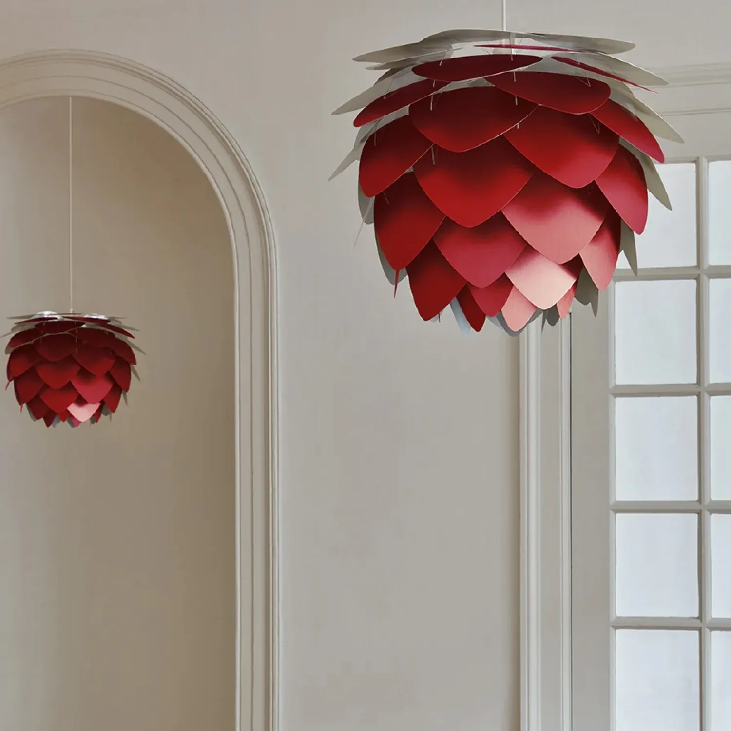Den smukke kogle-formede Aluvia mini lampeskærm i Ruby red fra Umage er lavet med blade af aluminium, som giver lampen et let og robust udtryk på samme tid. Denne lampeskærm giver dig mange muligheder i din indretning. Hæng fx lampen over dit spisebord eller i entreen – husk at tilkøbe . Eller brug den som gulvlampe med en eller som bordlampe med en .