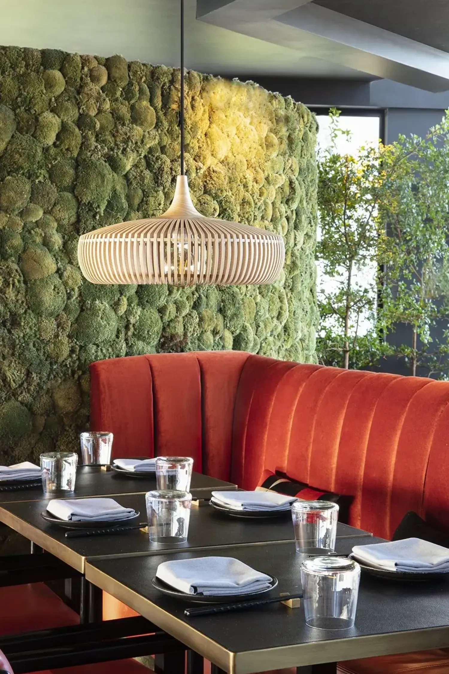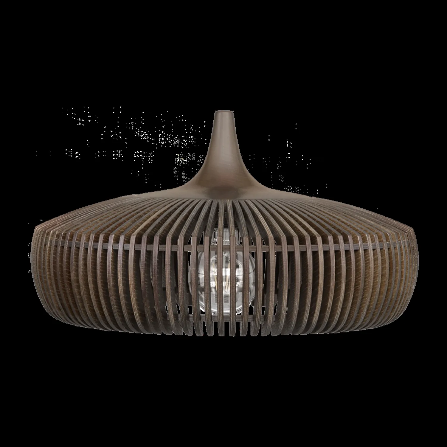 Smuk Umage Clava Dine Wood lampeskærm i et skulpturelt design, der giver et legende lysspil på rummets vægge. Lampen er designet med en håndværksteknik, der kræver stor præcision pga. den smalle afstand mellem lamellerne. Trælamellerne består af laserskåret ask- og egetræsfinér, mens toppen er i massiv egetræ.