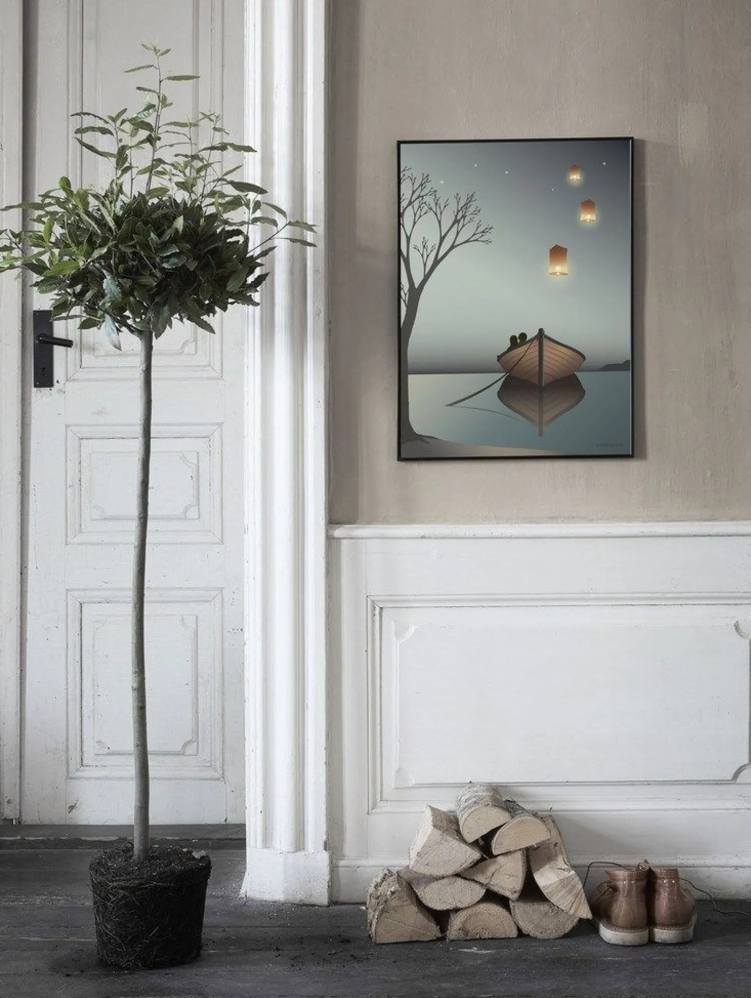 Denne plakat viser et natligt sceneri, der kan fungere som et visuelt fokuspunkt i et rum. Motivet med de svævende lanterner over en stille sø skaber et billede, der kan betragtes og fortolkes på forskellige måder. Den neutrale farvepalet gør plakaten velegnet til forskellige indretningsstile. VISSEVASSE – Lanternerne plakat er et stykke vægkunst, der kan tilføje et visuelt element til et rum. Plakatens motiv med lanterner, der engang blev brugt til at sende signaler, og som nogle i dag forbinder med held og lykke, giver mulighed for forskellige fortolkninger. Billedets komposition med stjernehimlen og den blikstille sø som baggrund skaber en scene, der inviterer til betragtning. Plakaten kan fungere som et dekorativt element, der tilføjer et stykke visuel kunst til væggen, uanset om den placeres i stuen, soveværelset eller et andet rum i hjemmet.