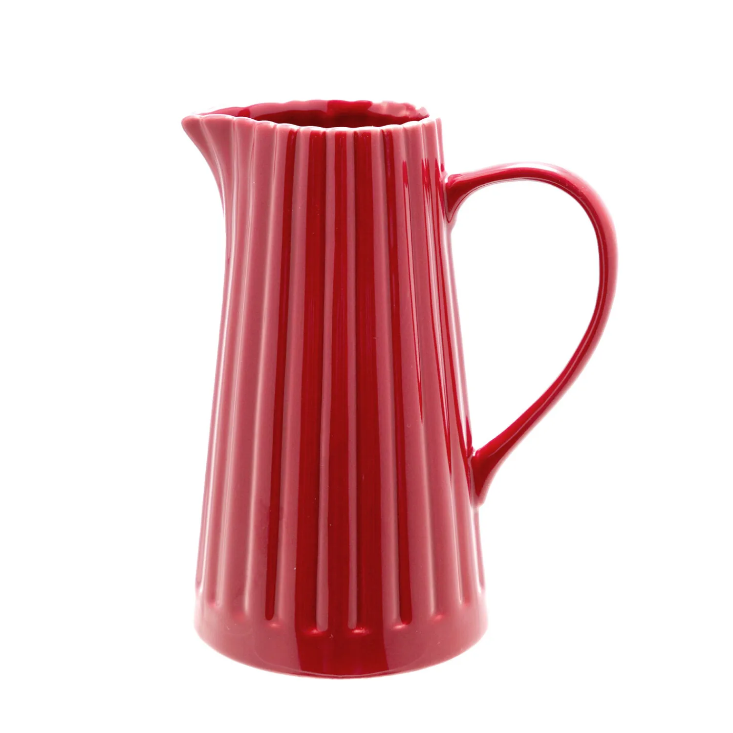 Denne røde stentøjskande fra Bloomingville kombinerer praktisk anvendelighed med karakteristisk design. Den lodrette ribbede tekstur og bølgede kant giver kanden sit særpræg, mens den rummelige kapacitet på 1.250 ml gør den ideel til servering.