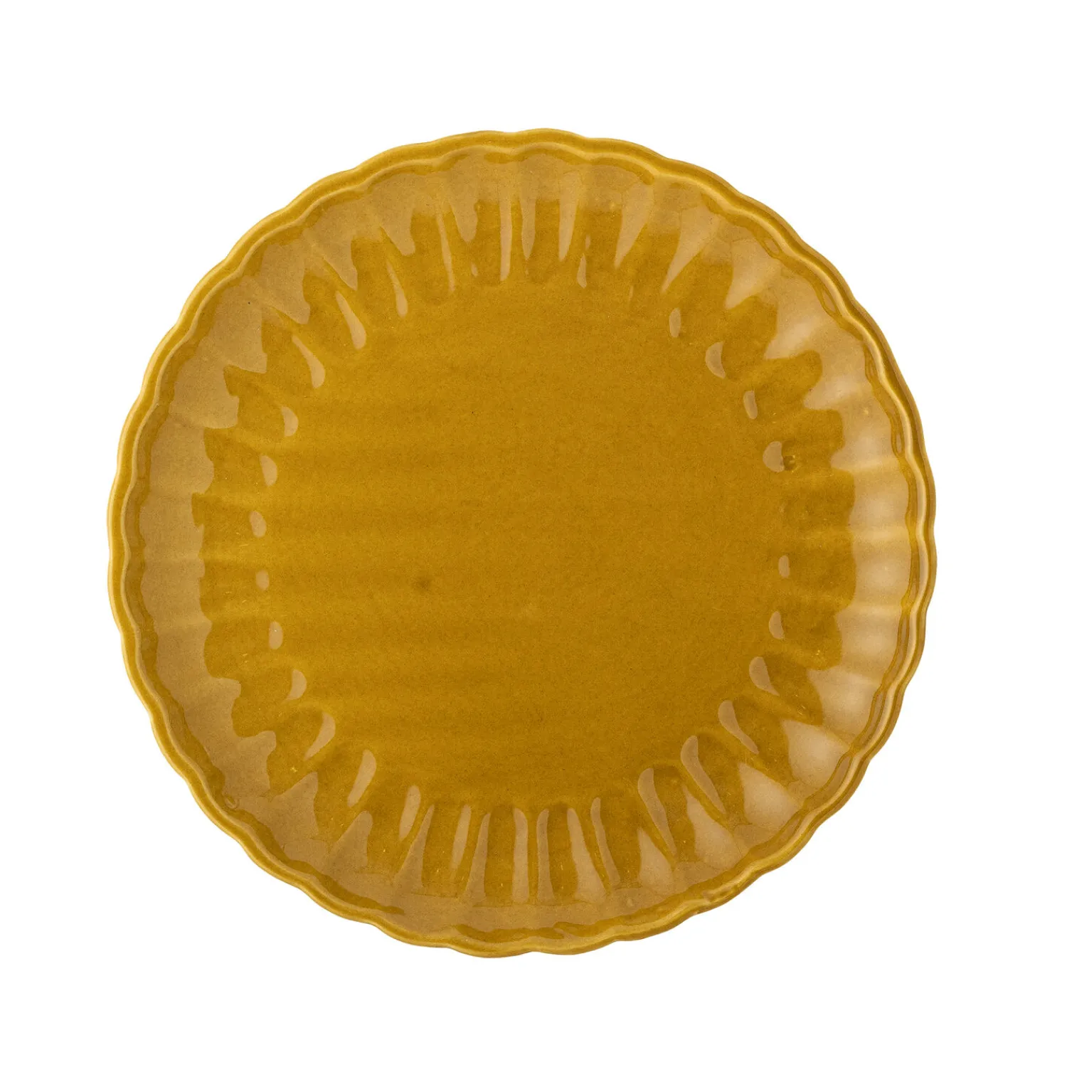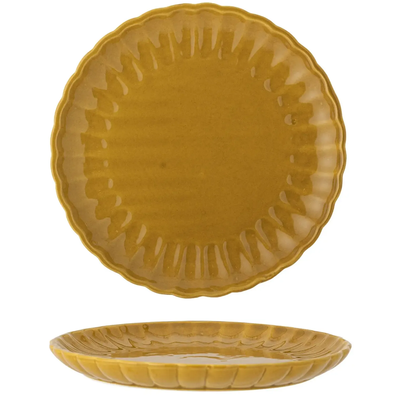 Håndlavet tallerken i holdbart stentøj med en karakteristisk bølget kant og dekorativt kantmønster. Den varme gule farve og den naturlige glasur giver hver tallerken sit eget særpræg gennem små farvevariationer.